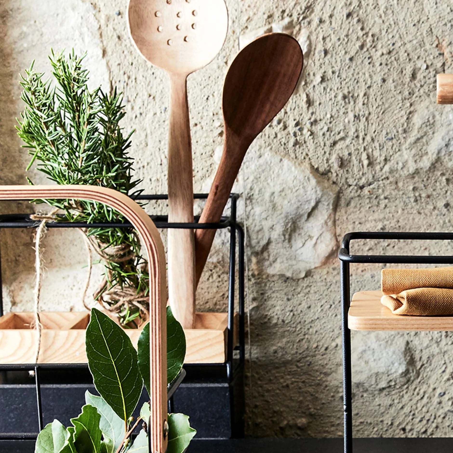 Un range couverts à 3 compartiments en bois et métal noir qui sera très pratique pour y ranger vos fourchettes, cuillères et couteaux. Une alliance de matières laissant émaner un esprit déco et authentique pour ce porte couverts que vous pourrez poser sur le plan de travail de la cuisine.