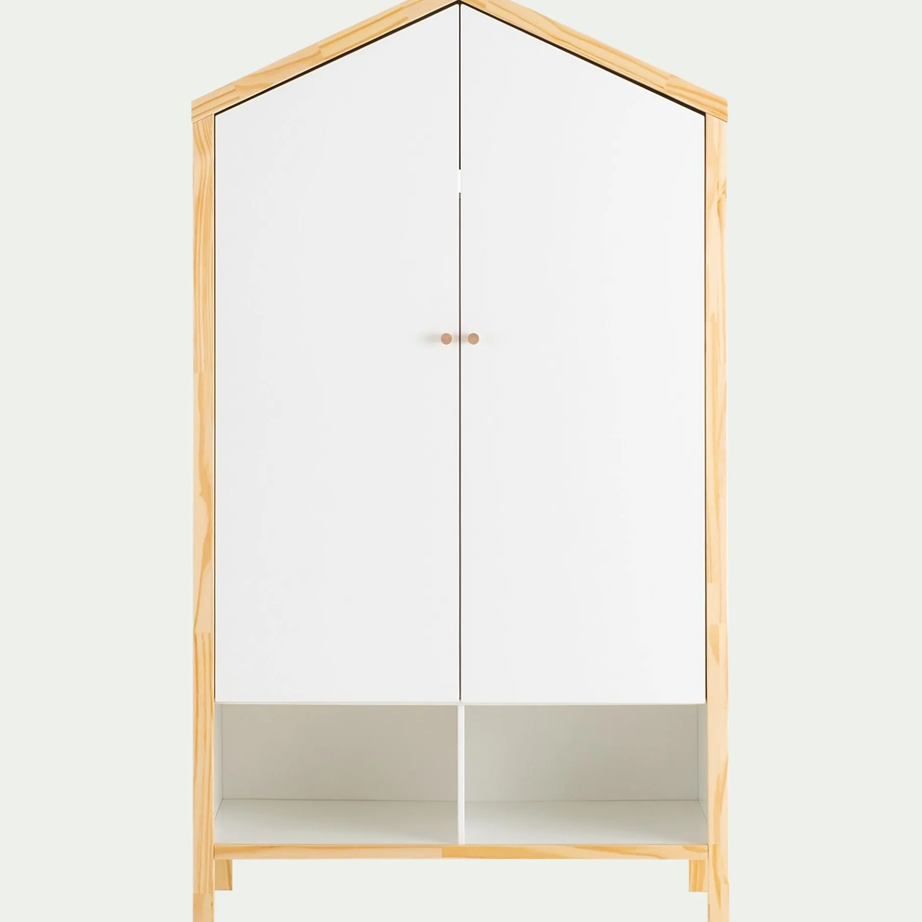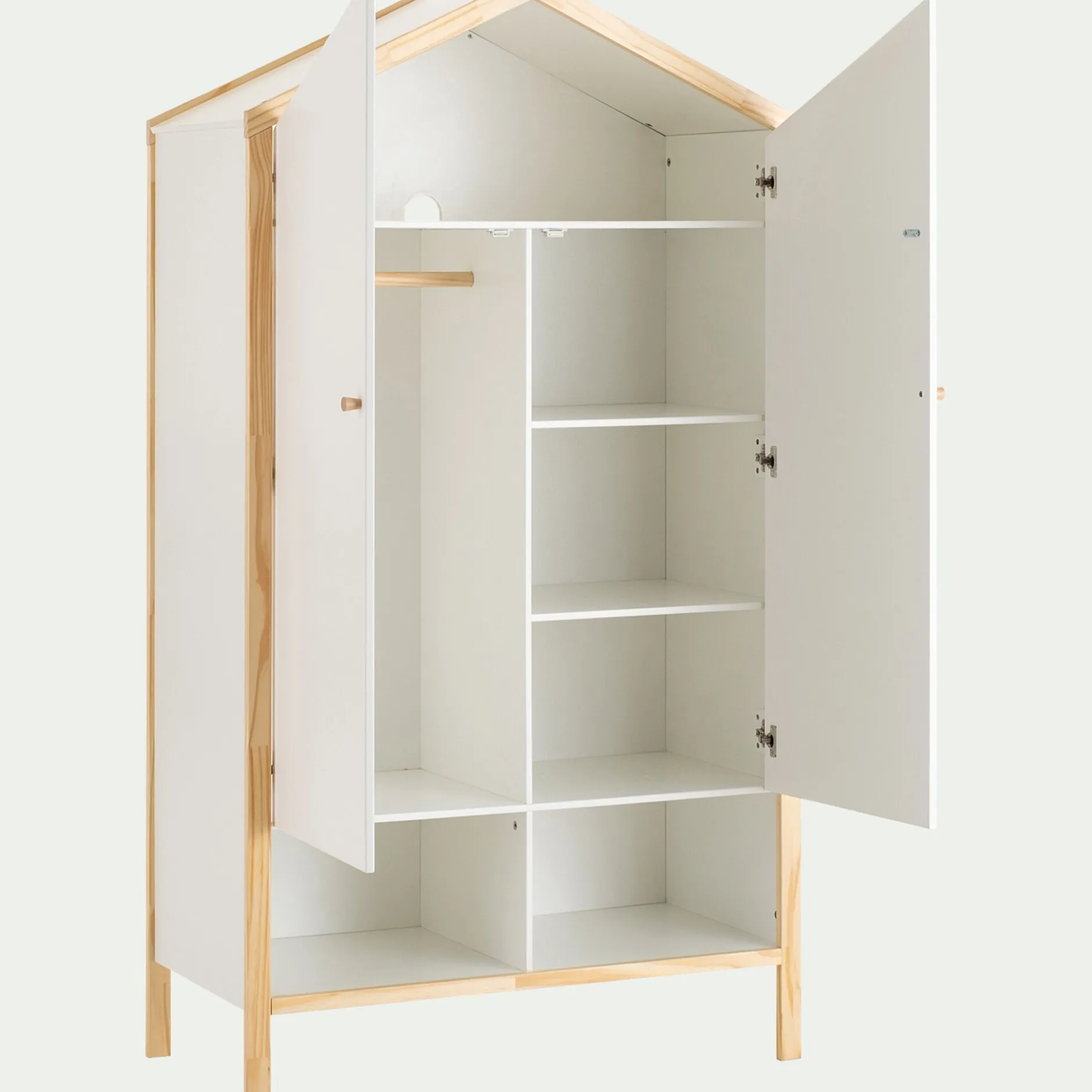 L’armoire Piloti transforme la chambre enfant en un véritable petit monde enchanté. Avec sa silhouette de maison coiffée d’un toit pointu, elle invite à l’imaginaire tout en étant fonctionnelle. Derrière ses deux portes battantes blanches se cachent six cases de rangement pour les vêtements pliés, les jouets ou les trésors, ainsi qu’une penderie pour suspendre les cintres. Pratique et ludique, cette armoire en bois blanc s’intègre avec douceur dans l’univers des enfants et ajoute une jolie touche décorative à leur cocon.