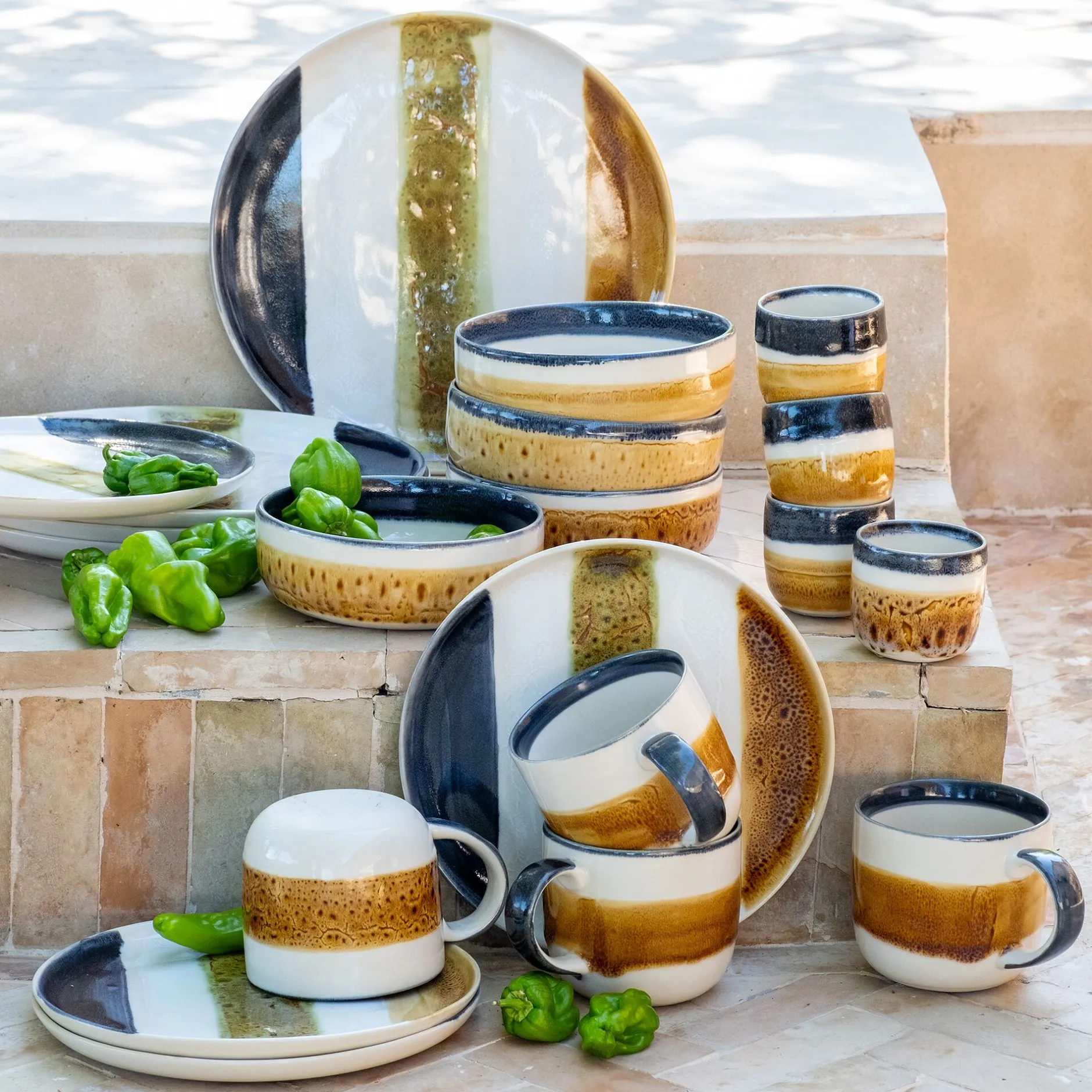 Affirmez votre sens du détail avec cette assiette plate en grès fabriquée au Portugal. Avec ses bandes colorées mêlant le brun moucheté, le vert olive et le bleu profond, chaque pièce affiche un style graphique et audacieux. Son émaillage contrasté évoque un savoir-faire authentique et apporte une vraie personnalité à votre dressage de table. Parfaite pour accueillir vos plats du quotidien ou vos recettes les plus élaborées, elle marie originalité et élégance avec naturel.
