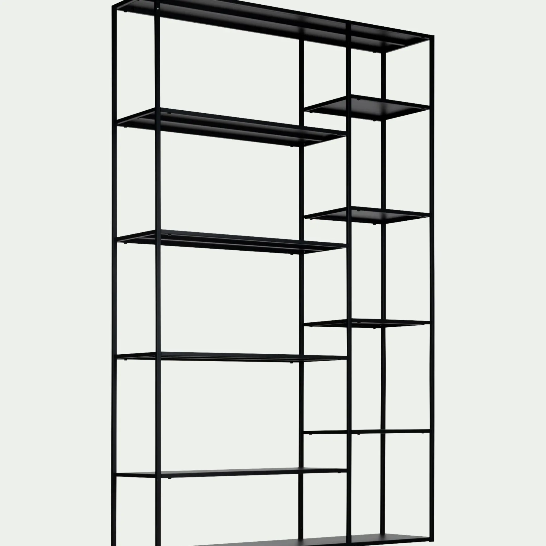 Cette belle bibliothèque à la structure fine et au style contemporain vous permettra de disposer vos objets déco et vos livres. Vous apprécierez ses lignes épurées et son design moderne. Cette bibliothèque noire présente une structure et des étagères en métal qui lui confère un style chic et élégant. Elle trouvera aisément place dans votre salon, afin de compléter avec charme la déco de votre pièce de vie et le mobilier existant.