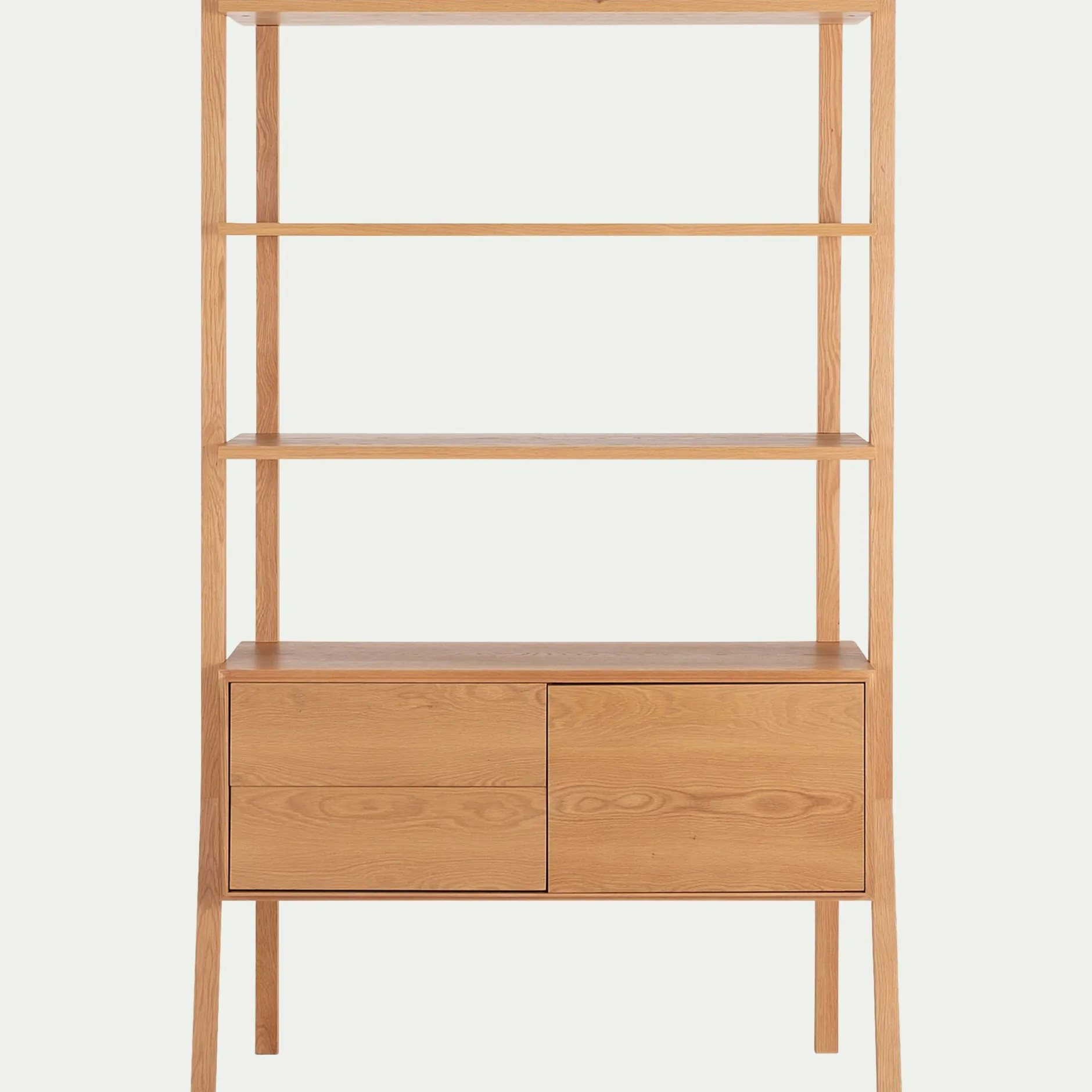 Grâce à ses lignes franches, cette bibliothèque arbore un design subtilement contemporain. D’apparence simple, elle cache pourtant un grand caractère que l’on retrouve par exemple dans son piètement légèrement biseauté. Confectionnée en chêne, cette bibliothèque au style naturel tire sa force de ses nombreux espaces de rangement. Elle se compose de 3 tablettes où exposer vos objets déco et livres, de 2 tiroirs coulissants pour vos accessoires de bureau et d’un placard qui s’ouvre sur deux casiers pour vos jeux de société. Fonctionnelle, cette étagère en bois est aussi belle que pratique. Dans le séjour ou le bureau, elle prend ses aises avec élégance et berce la décoration de son aura authentique.