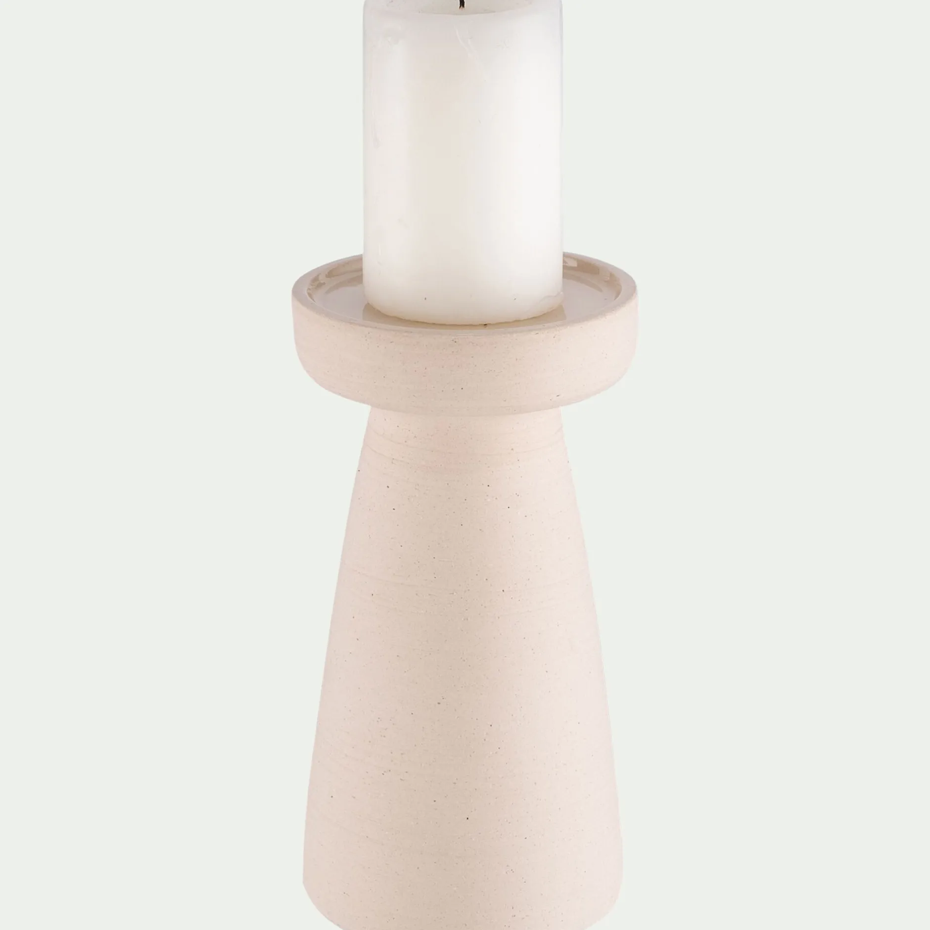 Ce bougeoir en grès beige mise sur une silhouette épurée et une matière brute pour attirer les regards. Son large pied cylindrique lui donne une belle présence, tandis que son socle supérieur accueille une bougie jusqu’à 10,5 cm de diamètre. Un objet décoratif à part entière, à disposer seul ou en duo pour créer une ambiance douce et chaleureuse.