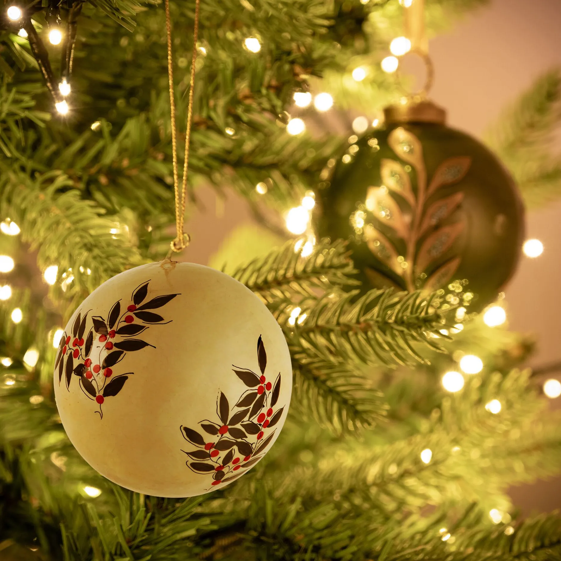Ce lot de boules de Noël en papier mâché capture l’esprit des fêtes avec son motif végétal peint à la main. Sur sa base blanche, des branches de houx se déploient, ornées de feuilles vertes et de baies rouges. Ce symbole incontournable de Noël évoque la magie et la tradition des fêtes de fin d’année. Suspendues dans le sapin, ces boules rondes apportent une touche de fraîcheur naturelle.