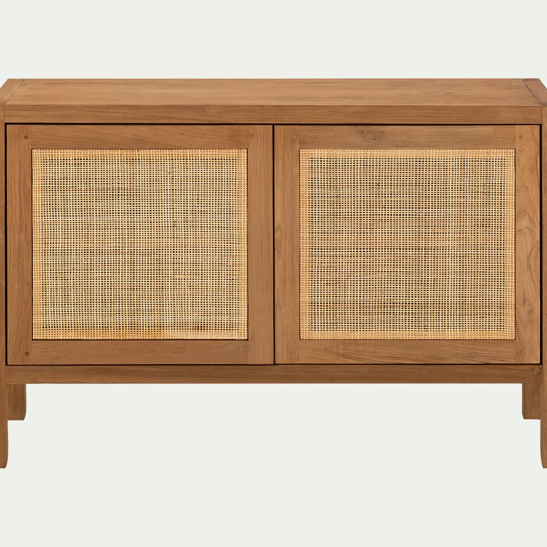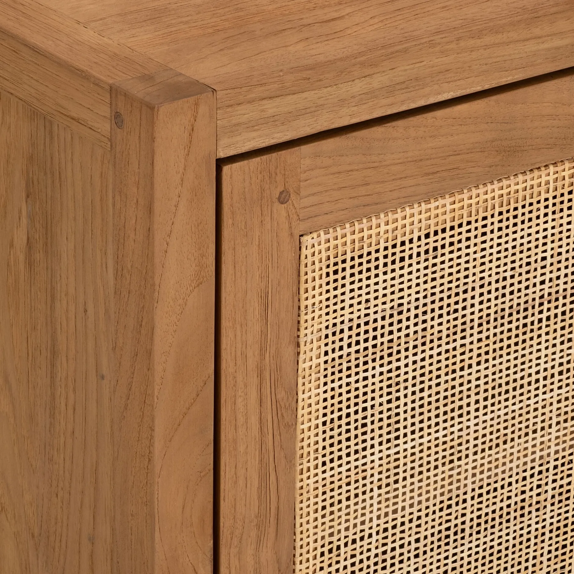 Ce buffet se joue des codes établis. Son mélange entre style urbain et authentique, mêlant graphisme et modularité en fait un meuble de salon audacieux. Sa structure en teck recyclé et son cannage lui donnent un aspect chaleureux et authentique. 2 portes en cannage battantes laissent apparaître de spacieux rangements dans lesquels vous pourrez disposer vos livres, vos appareils électroniques et autres objets du quotidien. Un meuble d’intérieur au design rempli de charme qui s’intégrera parfaitement dans votre pièce de vie.