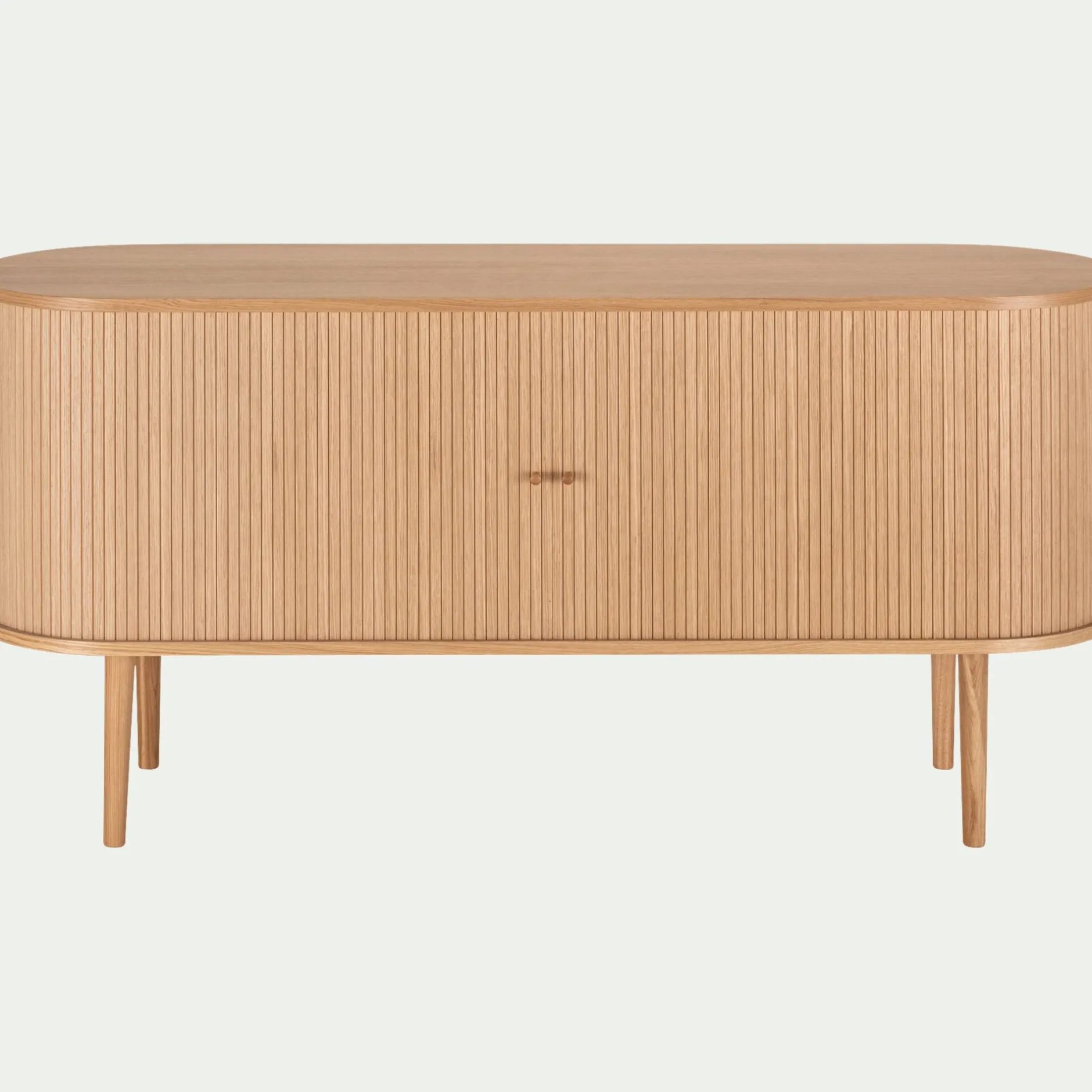 Jozo est un sublime buffet décoratif, à l’aura douce et exotique. Ce buffet bas présente une forme ovale : ses angles arrondis invitent à la détente et viennent apaiser l’atmosphère. Cette forme si particulière permet aux deux portes cannelées de coulisser le long du meuble. Cette ouverture atypique apporte du charme à ce buffet et au séjour tout entier. Ce buffet en bois arbore un coloris naturel, celui du chêne : une essence claire et striée de fines veinures. Ce buffet naturel est composé de quatre espaces de rangement, faisant de lui l’allié parfait d’un salon ordonné et agréable à vivre.