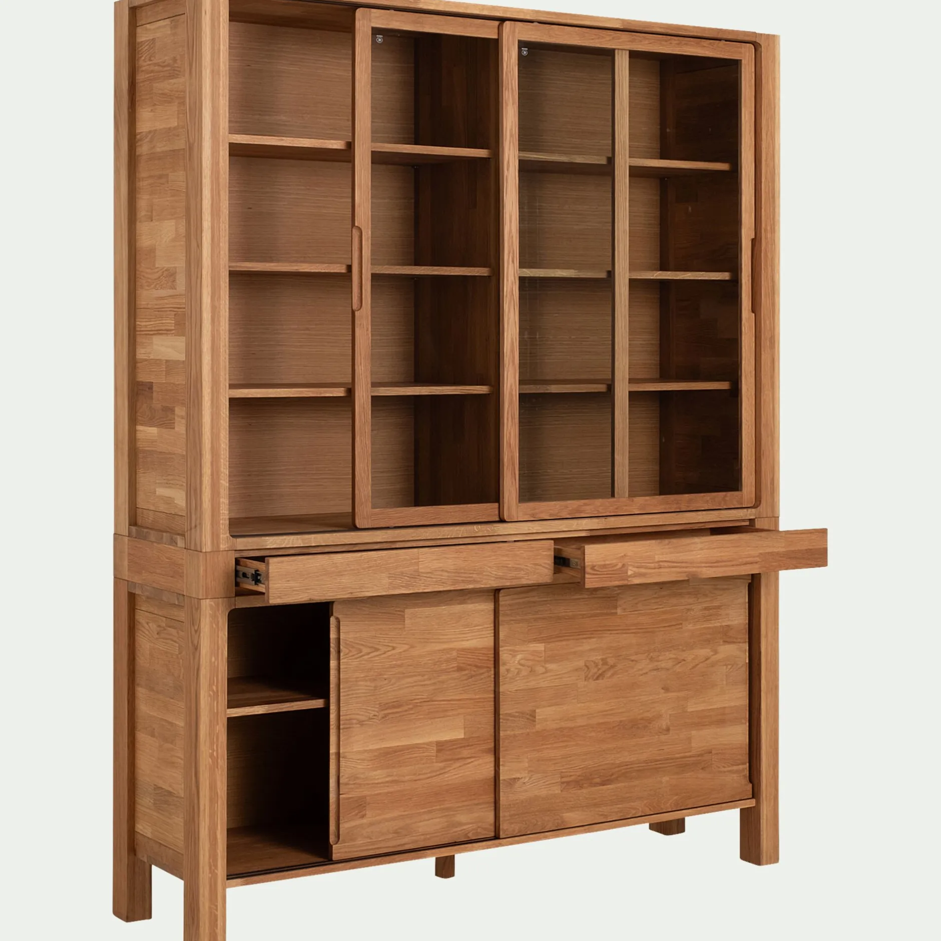 Ce vaisselier en chêne incarne l’élégance et la fonctionnalité dans toute leur splendeur. Ses deux portes coulissantes en verre trempé offrent un aperçu élégant de votre vaisselle et de vos objets précieux, ajoutant une touche de sophistication à votre espace. En bas, deux portes coulissantes en bois ajoutent une note de chaleur et de tradition, tandis que deux tiroirs pratiques offrent un espace supplémentaire pour ranger vos couverts ou vos documents. Ce vaisselier en bois certifié FSC allie le charme intemporel du chêne à une conception pratique et bien pensée, créant ainsi une atmosphère chaleureuse et organisée dans votre pièce.