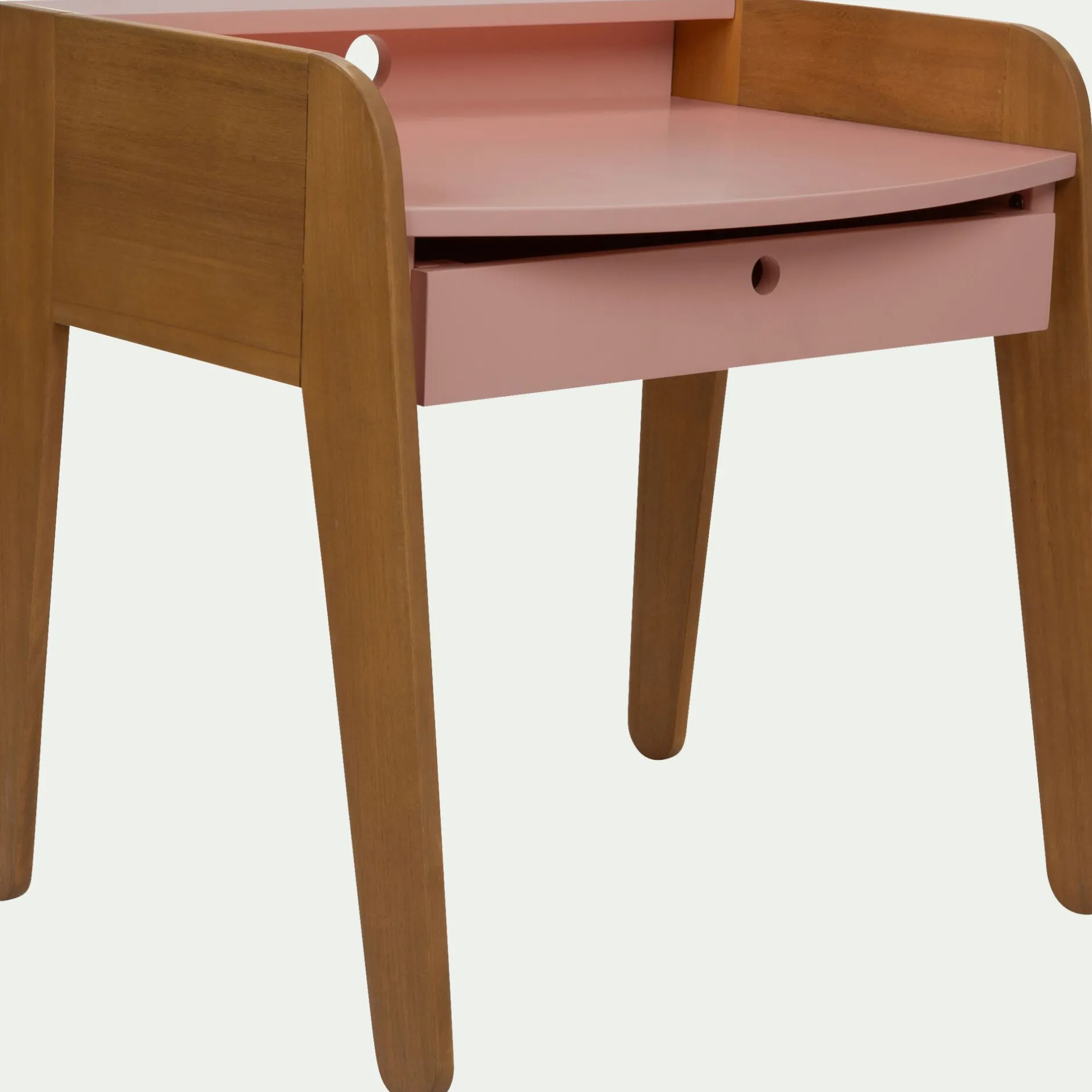 Bois acacia + MDF. (panneau de fibres de moyenne densité) en finition huilé couleur teck et finition lasuré rose.