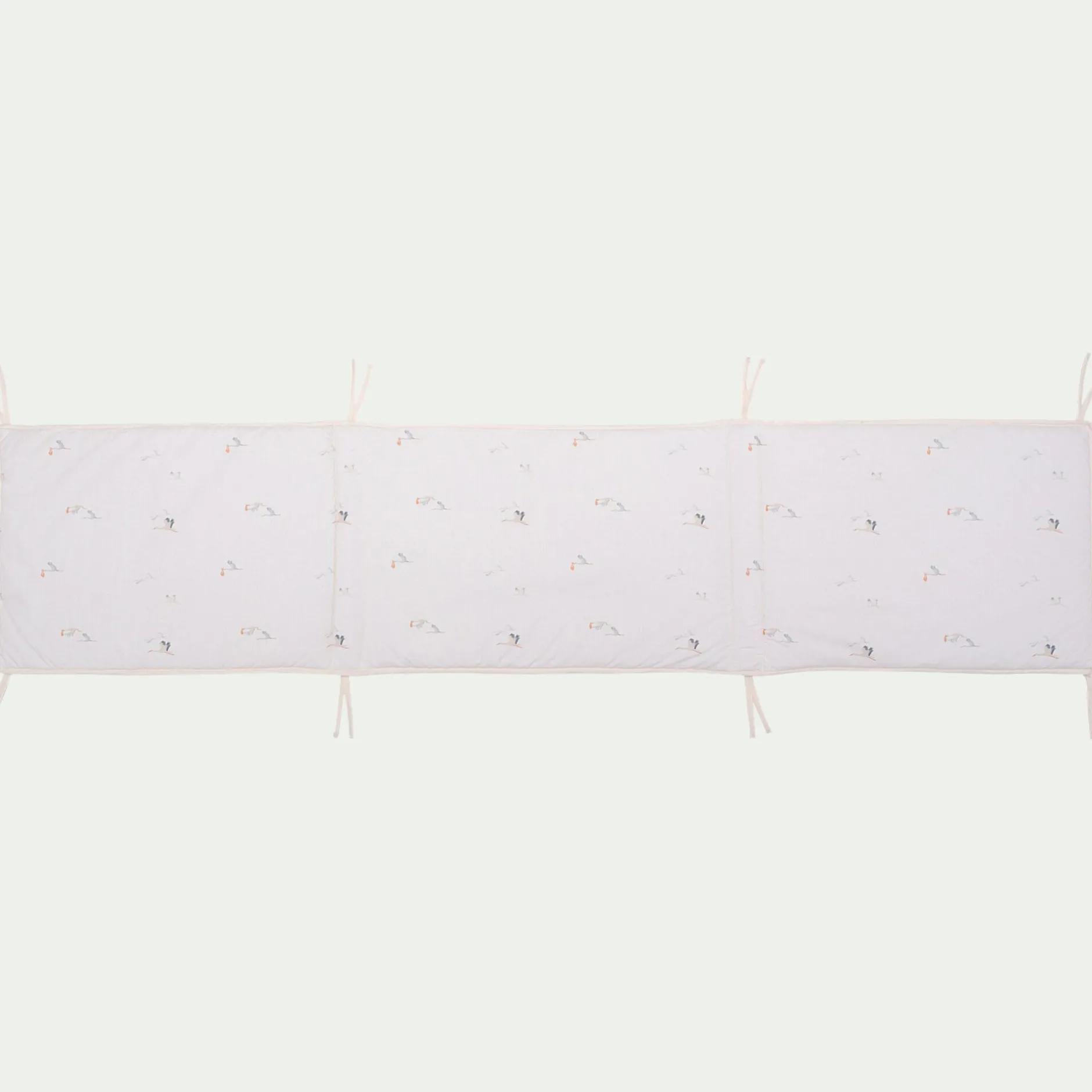 Ce tour de lit, conçu pour un lit bébé à barreaux de 60×120 cm, allie sécurité et douceur. En coton bio, il offre un contact naturel et respectueux de la peau délicate de bébé. Son motif de cigognes en plein envol, imprimé sur un fond blanc apaisant, crée une ambiance sereine propice au repos. Placé autour des barreaux, le tour de lit protège bébé des chocs et évite les courants d’air, tout en apportant une touche décorative harmonieuse à la chambre.