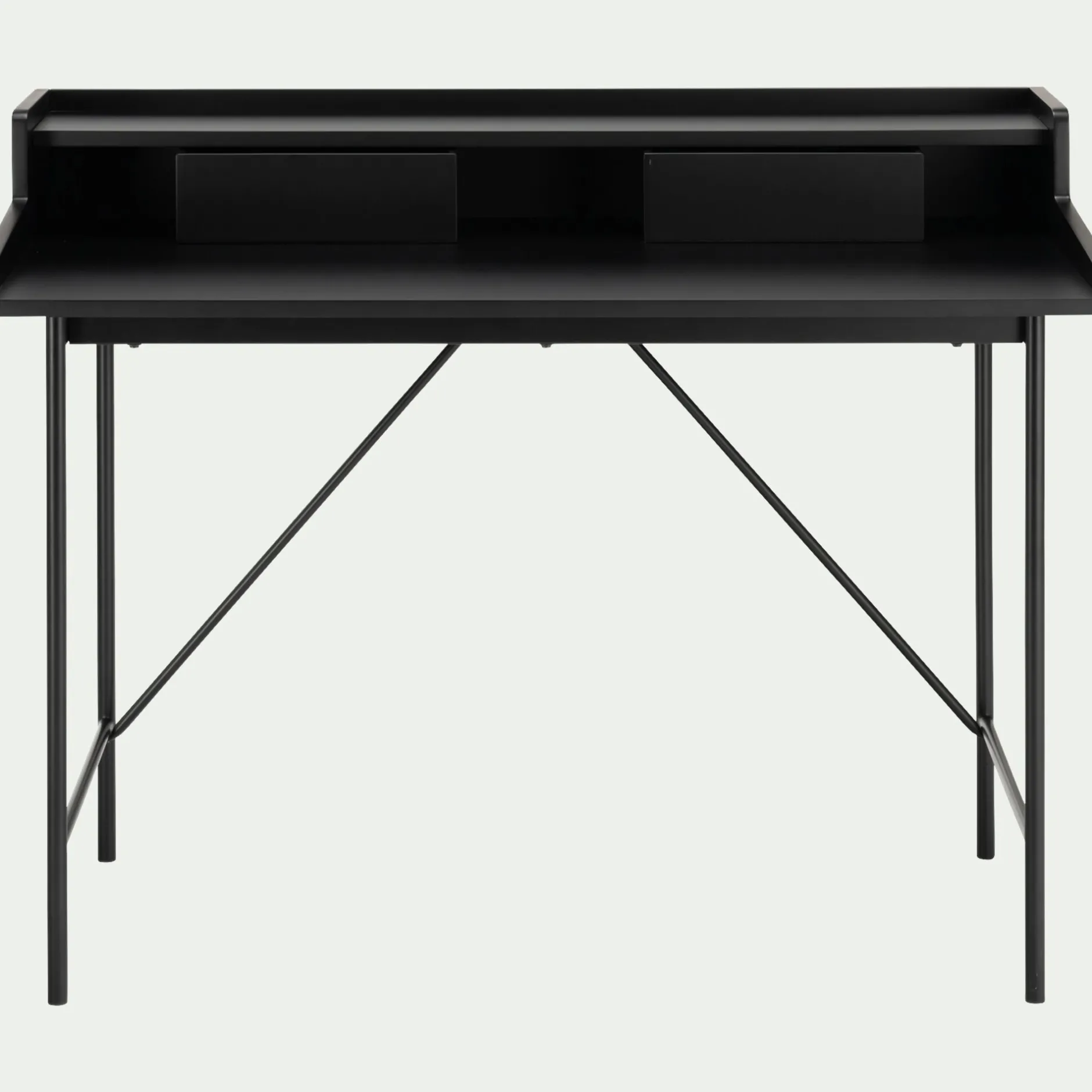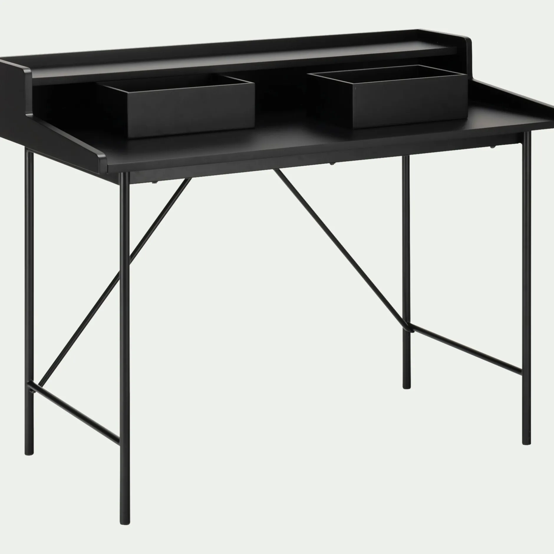 Lira est un bureau en bois aussi esthétique que pratique. Du plateau au piétement, ce bureau de travail est entièrement peint en noir mat. Ainsi, ce meuble d’accent apporte du contraste et de la profondeur à la pièce. Son total look noir le rend adaptable à tous les styles : moderne, contemporain, industriel… Un intemporel qui s’adapte aux saisons et à vos goûts. Ce bureau noir se compose d’un grand plateau principal et d’un petit plateau supérieur, idéal pour poser votre écran d’ordinateur. De cette façon, votre corps adopte naturellement une posture saine. Deux boîtes de rangement viennent compléter l’ensemble. L’occasion d’avoir un bureau organisé où travailler devient un plaisir.