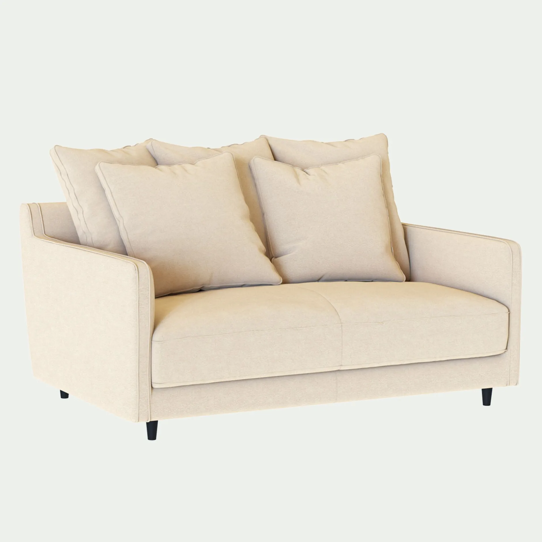 Assise et dossier : Assise en mousse polyuréthane densité 30kg/m3 et couette en fibre polyester. Coussins dossier garnissage plumes d’oies et fibres polyester, 3 coussins de 60x60cm, 2 coussins de 50x50cm.