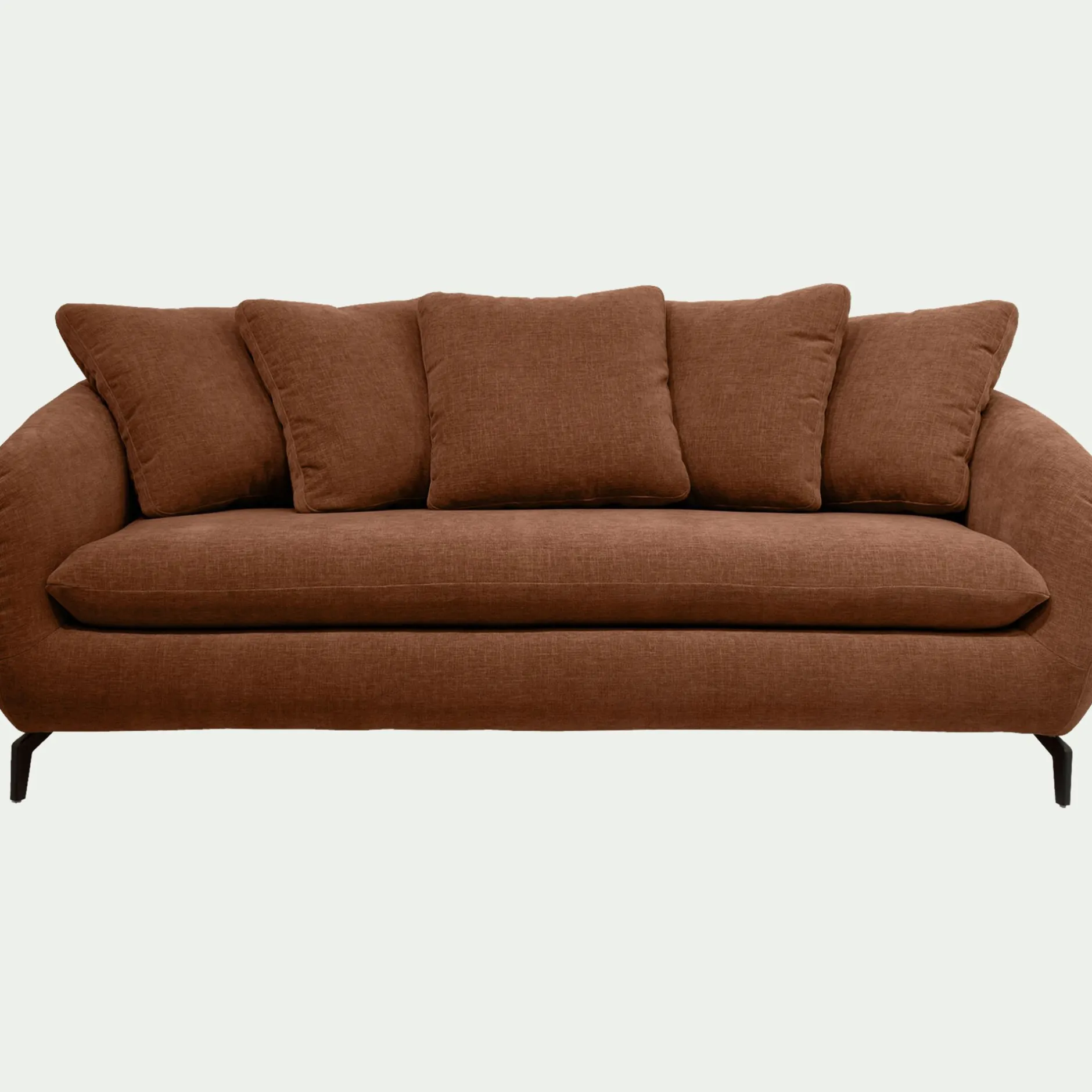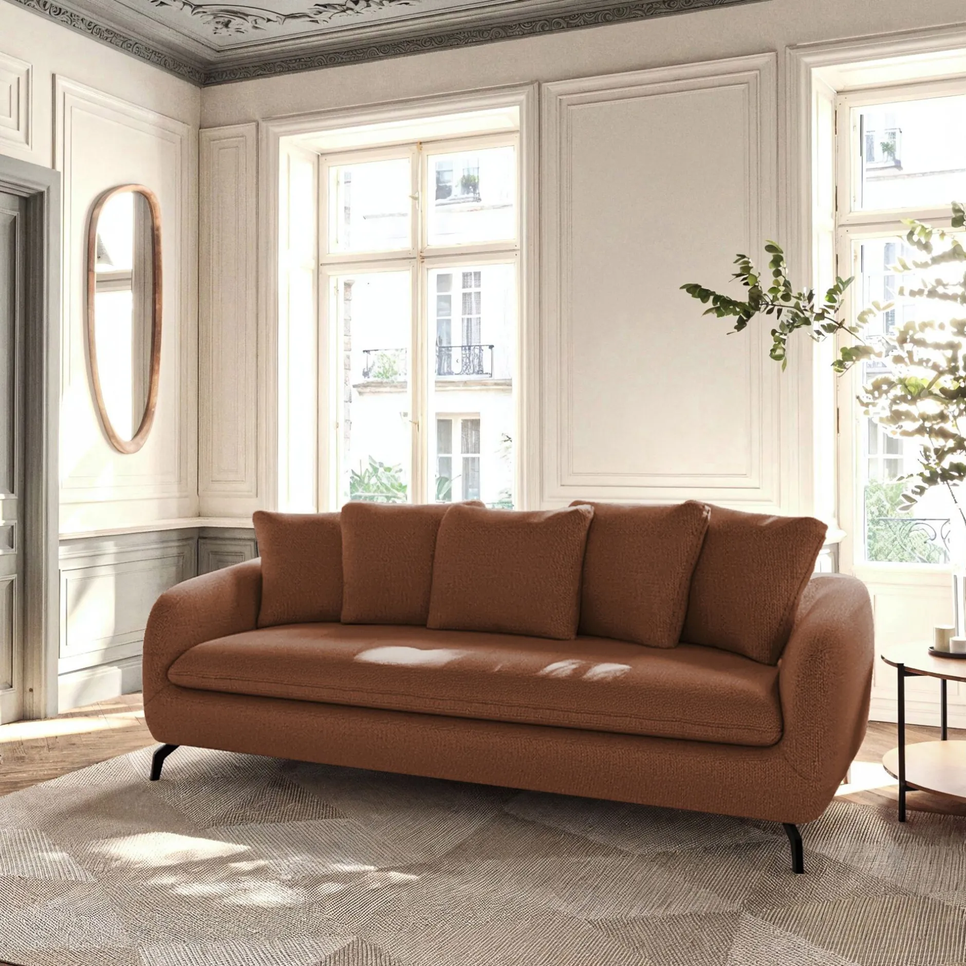 Un joli canapé convertible en tissu pour profiter agréablement de votre salon. Un look contemporain et accueillant, sublimé par un piétement original en acier noir. Vous apprécierez la forme du dossier et des accoudoirs qui vous offrent un maintien optimal de votre dos pour un confort d’assise exceptionnel. Un canapé fabriqué en France, dans des ateliers proches de la ville de Bourge, qui incarne l’excellence du savoir-faire français. Un coloris brun rustrel qui apporte une note lumineuse et tendance à votre déco de salon.