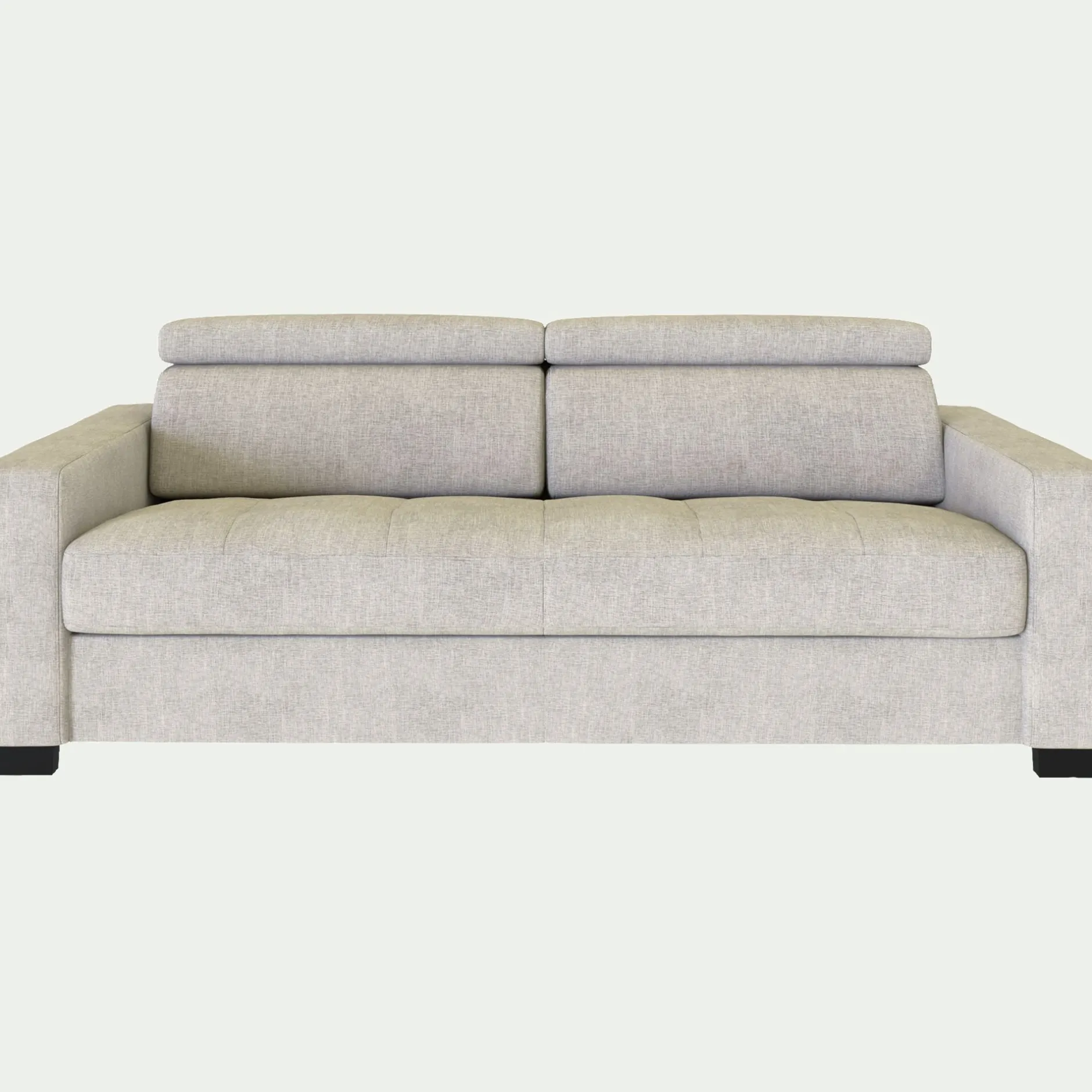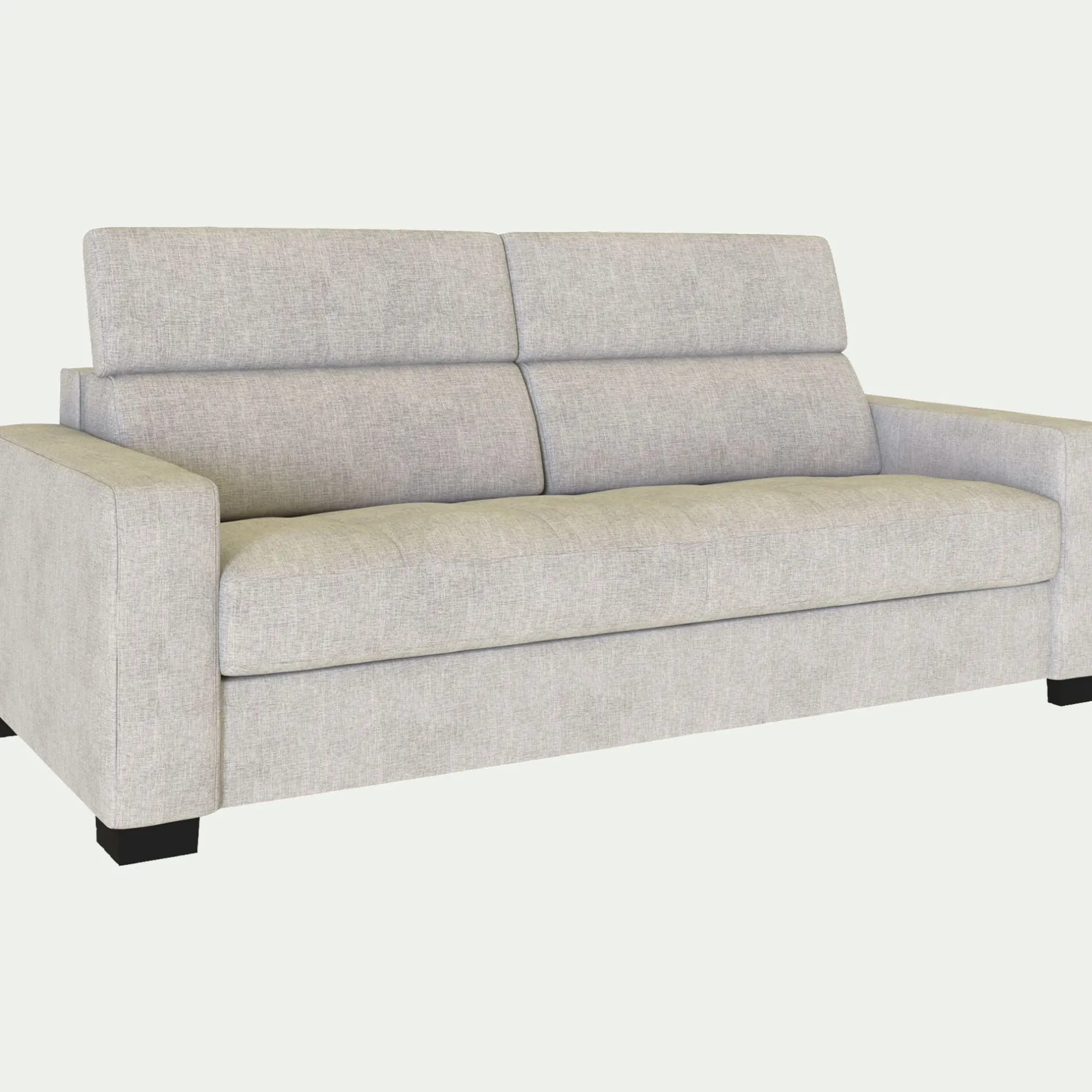Ce canapé droit 3 places ajoute au salon une élégance intemporelle et un confort remarquable. Confectionné en Italie, il repose sur une structure robuste en bois certifié FSC, garantissant une grande durabilité dans le temps. Son assise et son dossier en mousse offrent un accueil moelleux, idéal pour les instants de repos. Revêtu de tissu, ce canapé fixe propose un toucher agréable été comme hiver. Ce canapé en tissu arbore notre coloris beige roucas, une teinte chaleureuse et tendance. Son design sobre et raffiné s’intègre facilement dans différents styles, du contemporain au plus classique. Ses accoudoirs de 20 cm et ses têtières inclinables participent à un confort incomparable.