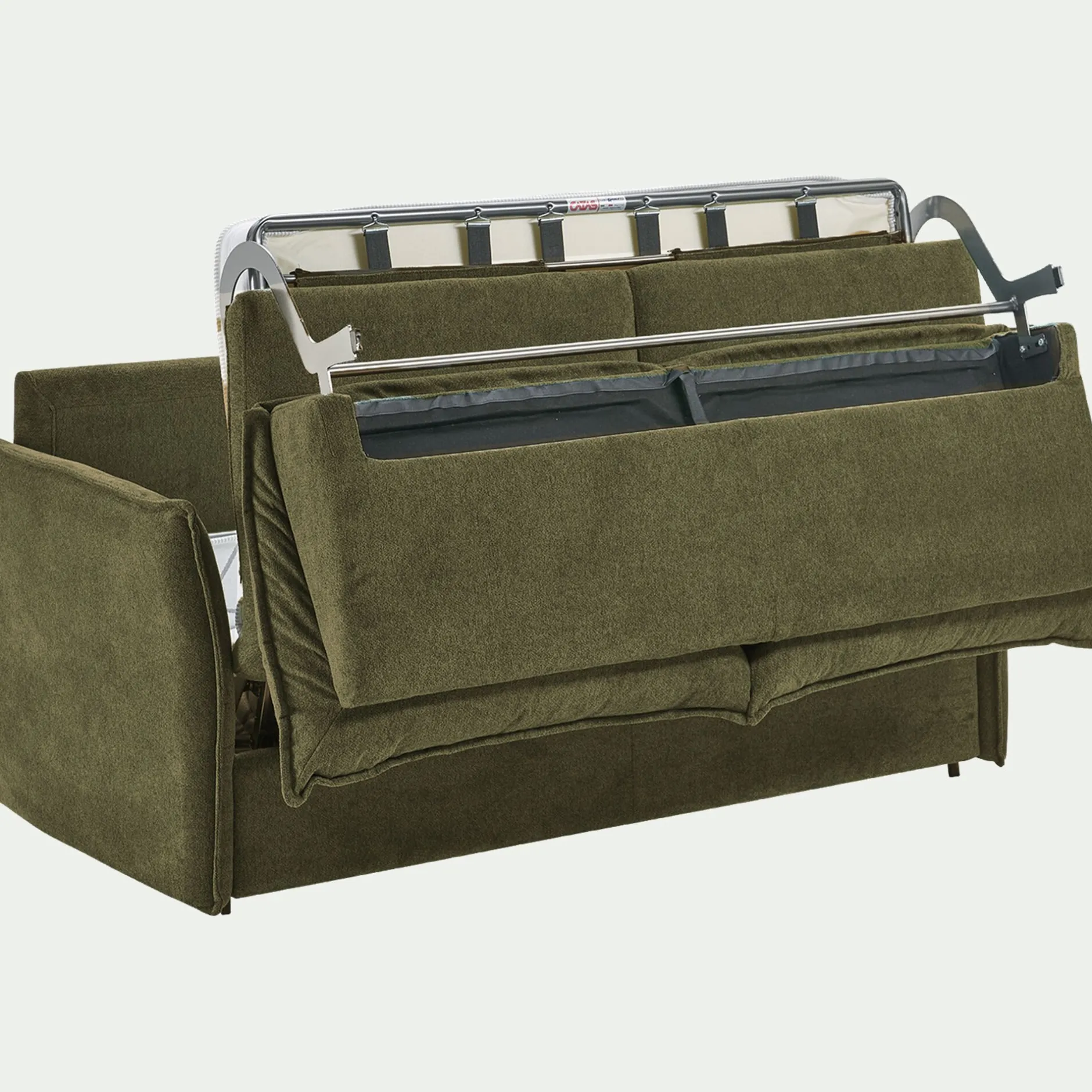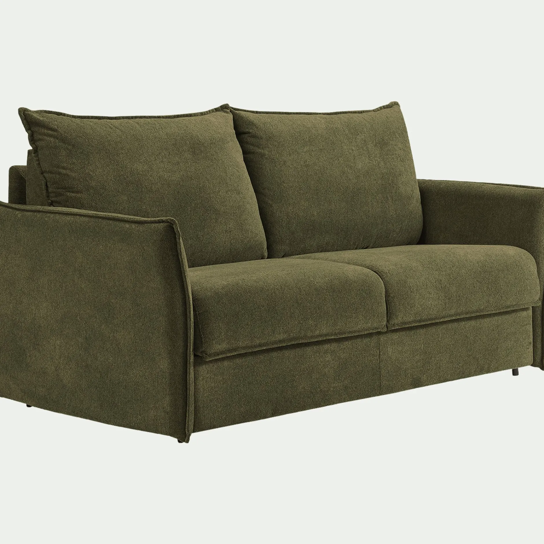 Le canapé Moya offre un soutien optimal adapté à chaque partie du corps. Ce canapé 3 places convertible à la fabrication italienne, confectionné à partir du savoir faire local, vous permet de vous détendre dans une pièce hautement qualitative. Le soir, dépliez votre canapé et transformez-le en un lit au couchage 140×195 cm d’une densité de 35kg/m3 qui vous permettra d’accueillir famille et amis. Très confortable, ce canapé peut servir de couchage quotidien. Son mécanisme métallique vous permet de le déplier en quelques secondes sans enlever ses coussins. Ce canapé en tissu, avec sa couleur vert cèdre et son liseré décoratif, apportera de l’élégance à votre salon.