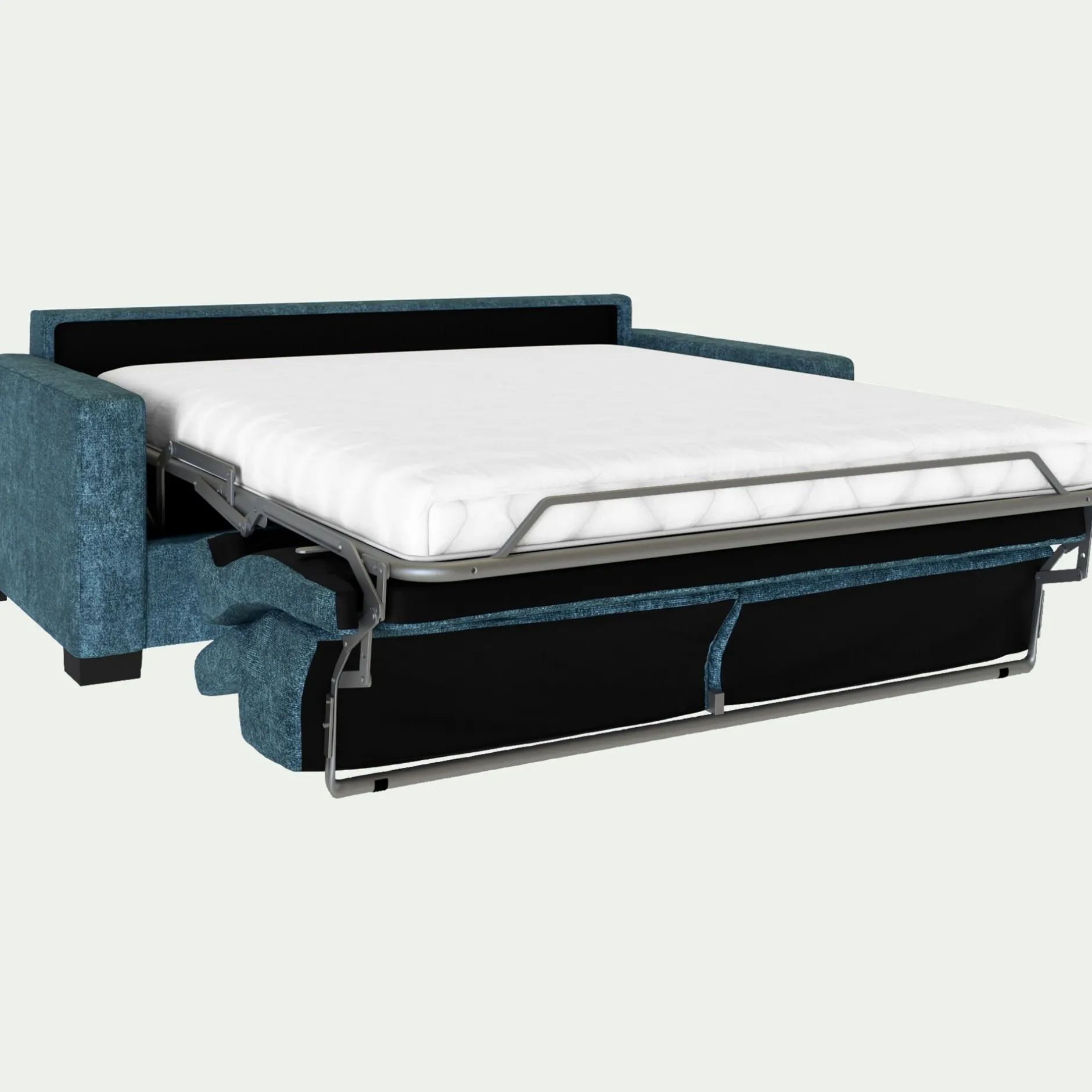 Mauro est une gamme de canapés au style contemporain et d’une grande élégance. Conçu en Italie, il est le fruit d’un travail minutieux et d’un savoir-faire unique. Ce canapé 3 places bleu figuerolles, arborant de larges accoudoirs et des têtières relevables, vous procurent un confort d’assise incomparable et vous invite à savourer d’agréables moments de détente. Convertible, il vous permet de pouvoir accueillir familles et amis sur son matelas Bultex. Un meuble de fabrication européenne qui sera la pièce maîtresse de votre salon va et sublimera votre décoration d’intérieur.