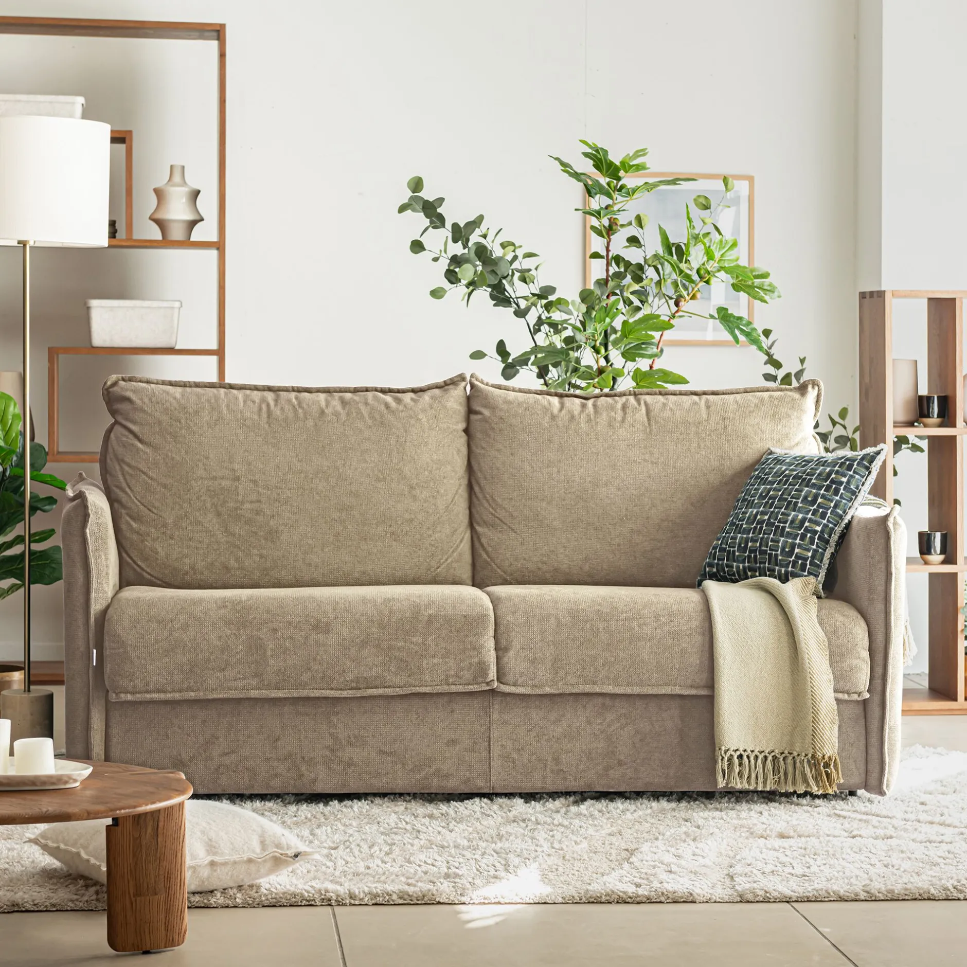 Le canapé Moya offre un soutien optimal adapté à chaque partie du corps. Ce canapé 4 places convertible à la fabrication italienne, confectionné à partir du savoir faire local, vous permet de vous détendre dans une pièce hautement qualitative. Le soir, dépliez votre canapé et transformez-le en un lit au couchage 160×195 cm d’une densité de 35kg/m3 qui vous permettra d’accueillir famille et amis. Très confortable, ce canapé peut servir de couchage quotidien. Son mécanisme métallique vous permet de le déplier en quelques secondes sans enlever ses coussins. Ce canapé en tissu, avec sa couleur beige roucas et son liseré décoratif, apportera de l’élégance à votre salon.