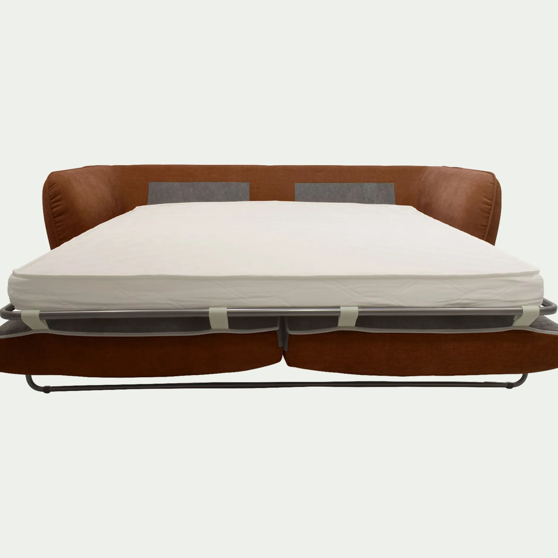 Avec son design épuré et son tissu brun rustrel, ce canapé 4 places convertible apporte une touche lumineuse et chaleureuse au salon. Son assise profonde et moelleuse invite à la détente, tandis que ses lignes élégantes en font une pièce de caractère à la fois cosy et raffinée. Assez spacieux, il offre encore plus de confort pour les moments de convivialité en famille ou entre amis. Astucieux, ce canapé droit se transforme en un clin d’œil en un couchage confortable de 160×190 cm. Son système express permet de déployer un sommier avec matelas instantanément, idéal pour recevoir des invités à la dernière minute. De jour comme de nuit, ce canapé en tissu s’adapte aux besoins de chacun.