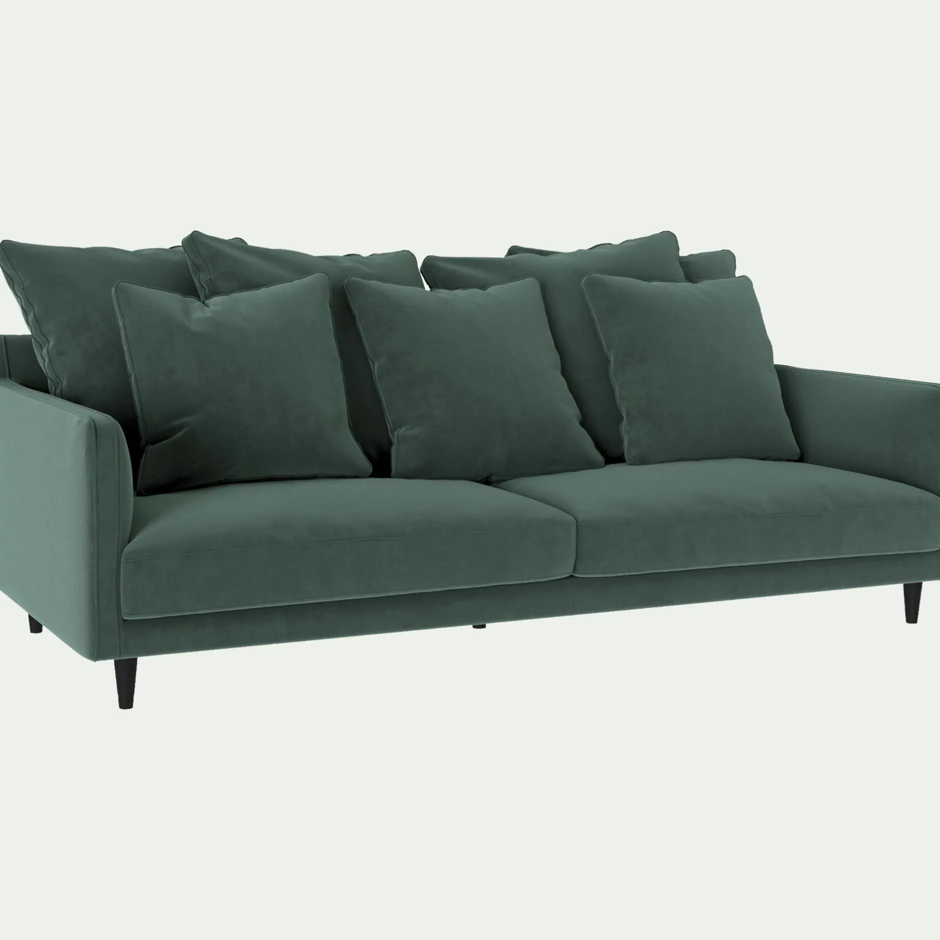 Ce canapé droit 4 places incarne l’élégance italienne dans une version chaleureuse et lumineuse. Revêtu du tissu velvet, au toucher charnu et à l’apparence de velours, il séduit par sa texture délicate et sa douceur exceptionnelle. Son coloris vert sauge adoucit la pièce et insuffle un vent apaisant au décor. Fabriqué à la main en Italie, il témoigne d’un savoir-faire artisanal raffiné. L’assise, généreusement garnie de plumes d’oie, offre un confort moelleux et enveloppant. Monté sur des pieds en hêtre massif, ce modèle entièrement déhoussable marie esthétique et praticité avec brio. Une pièce forte et rayonnante pour sublimer le salon.