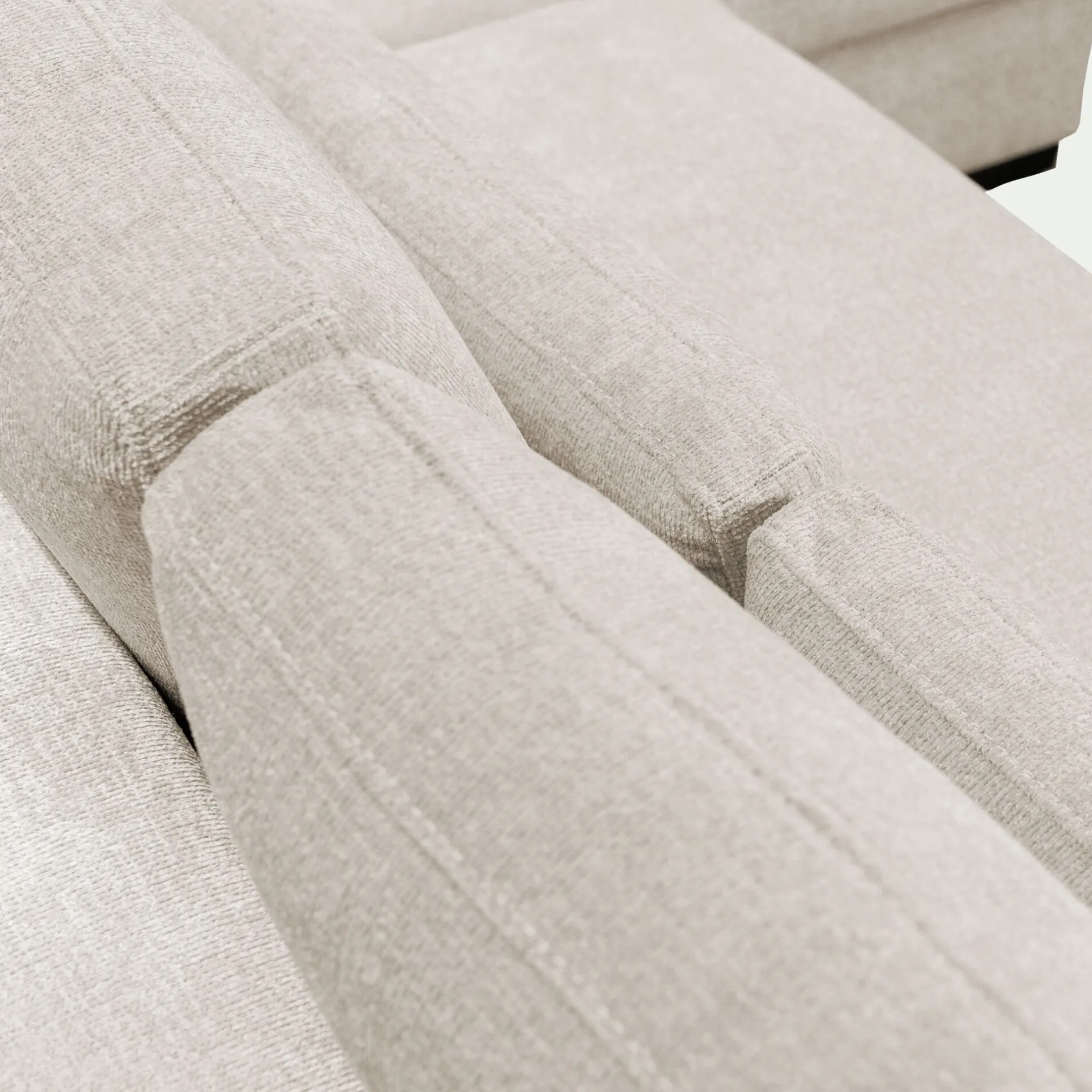 Généreux et élégant, le canapé d’angle Batis avec angle à droite invite à la détente. Son grand format permet d’accueillir jusqu’à 4 personnes, parfait pour aménager un vaste salon. La chaise longue offre un espace idéal pour s’allonger et profiter d’un véritable moment de repos. Son revêtement en tissu tramé, à la fois duveteux et soyeux, ajoute une touche de raffinement tout en assurant un confort optimal. Ce canapé fixe arbore un coloris beige qui illumine la pièce et s’accorde facilement avec toutes les ambiances. Robuste, ce canapé d’angle en tissu repose sur une structure solide pour garantir stabilité et durabilité. Son design sobre et contemporain en fait une pièce maîtresse du salon, où se mêlent convivialité et bien-être.