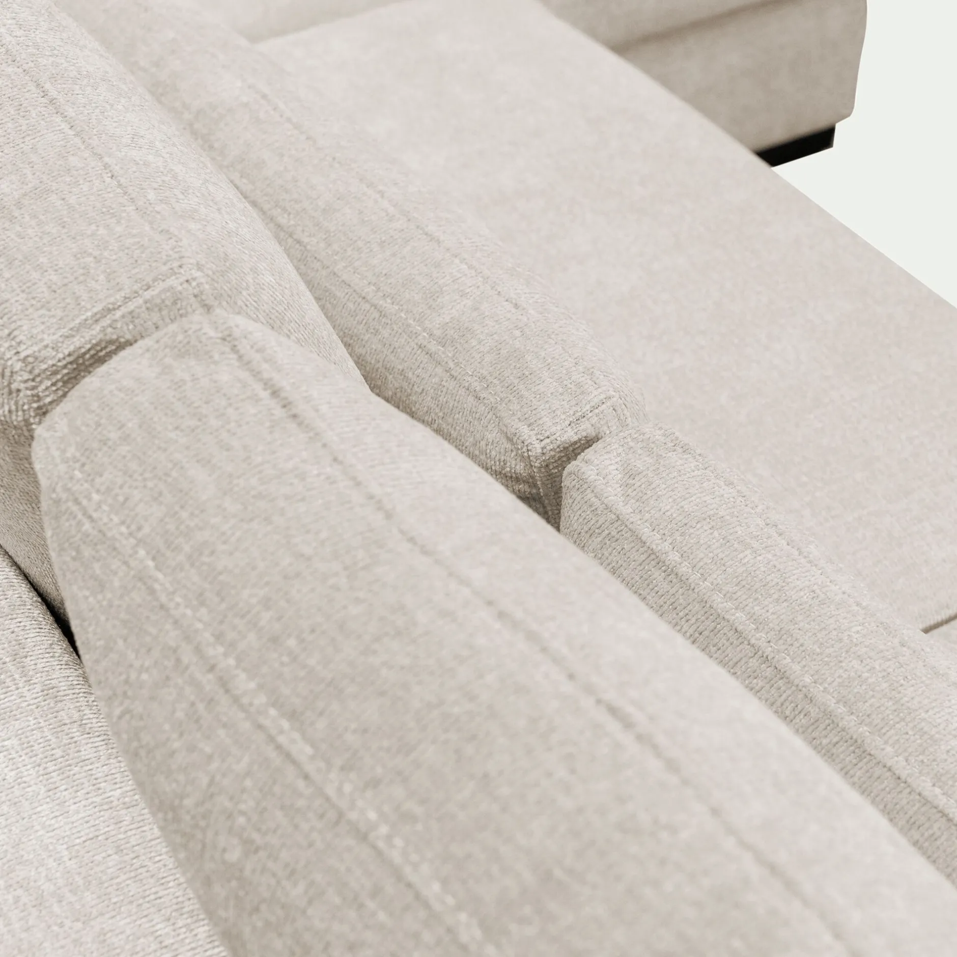 Généreux et élégant, le canapé d’angle Batis avec angle à gauche est idéal pour aménager un grand séjour. La chaise longue offre un espace idéal pour s’allonger et profiter d’un véritable moment de repos. Son revêtement en tissu tramé, à la fois doux et résistant, ajoute une touche d’élégance tout en assurant un confort optimal. Ce canapé fixe présente une couleur beige, douce, lumineuse et raffinée. Solide, ce canapé d’angle en tissu repose sur une structure en bois massif. Son design contemporain en fait une pièce phare du salon, où se mêlent convivialité et bien-être.
