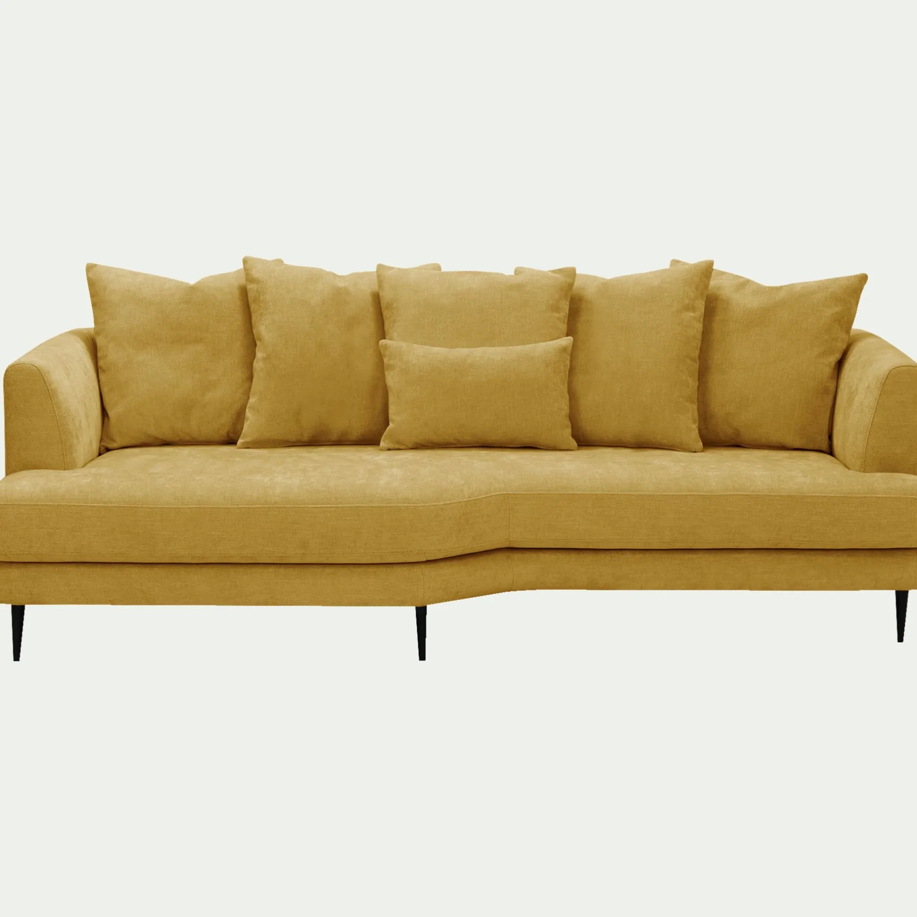 Avec sa découpe originale et asymétrique sur le côté gauche, ce canapé 5 places impose une allure unique et raffinée dans le salon. Son design singulier se marie à l’élégance discrète de son coloris jaune argan, doux et intemporel, pour sublimer la décoration intérieure. Son décroché crée une assise plus profonde, idéale pour savourer des instants de détente dans un confort absolu. À la fois atypique et sophistiqué, ce canapé fixe en tissu devient une pièce maîtresse du séjour et ne manquera pas de séduire les convives par son charme distinctif.