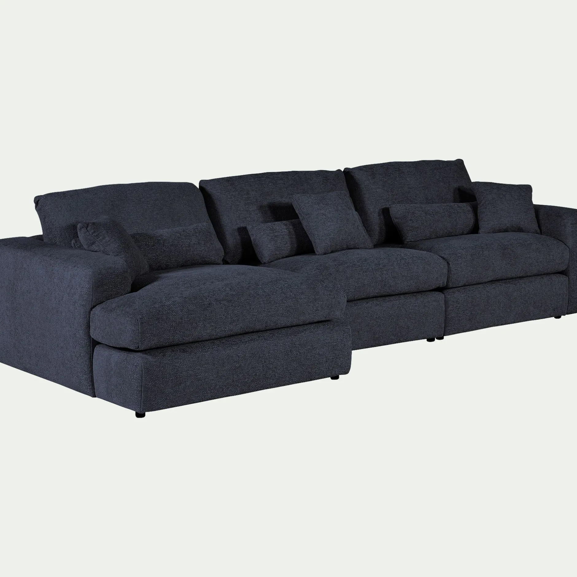 Avec son format généreux 5 places et son angle à gauche, ce canapé d’angle est une invitation aux moments partagés. Son revêtement en tissu chenille, à la fois doux et résistant, enveloppe l’espace d’une chaleur réconfortante. Son coloris bleu marine, intemporel, s’harmonise avec tous les styles d’intérieur. Pensé pour le confort, ce canapé fixe se compose d’une assise spacieuse, d’un dossier accueillant et de coussins déhoussables pour un entretien facilité. Six coussins décoratifs viennent parfaire l’ensemble, ajoutant une touche cosy. Un canapé idéal pour des instants de détente en famille ou entre amis.