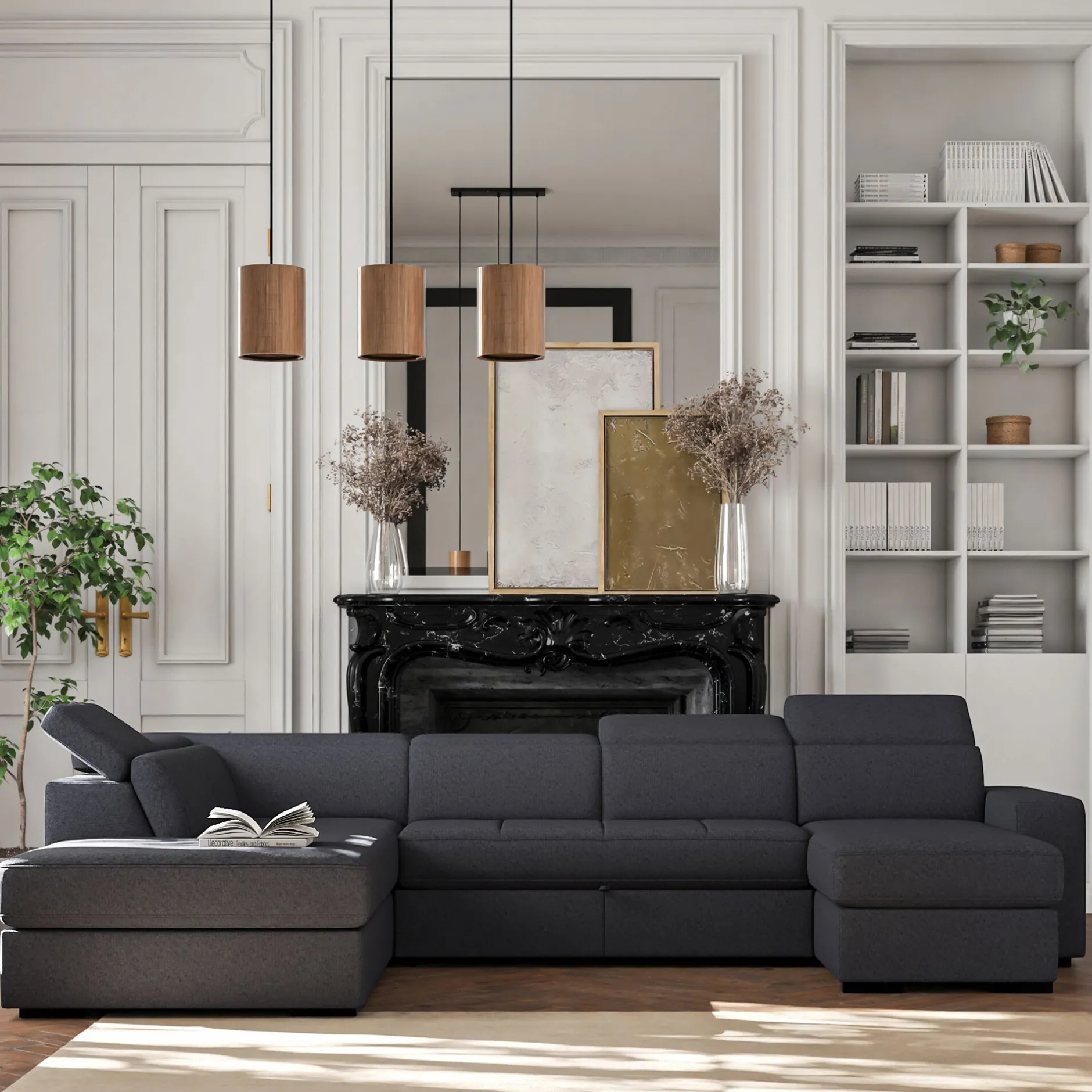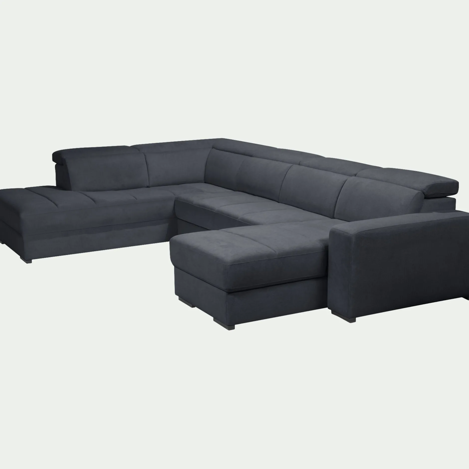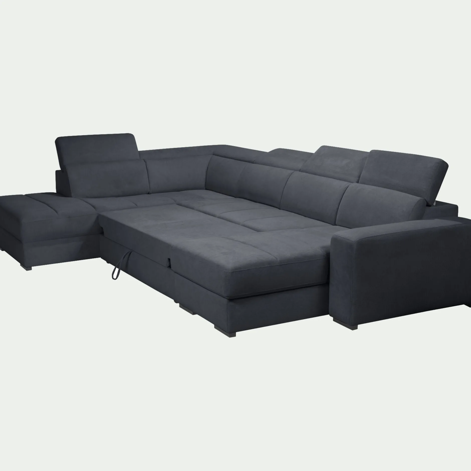 Un superbe canapé en U en tissu d’une couleur bleu calabrun, idéal pour un grand salon. Ce canapé vous offre un espace détente spacieux et confortable avec son assise capitonnée et ses têtières relevables qui accompagneront tous vos mouvements. Convertible, il met à votre disposition un couchage d’appoint de 130×200 cm avec un matelas de 10 cm d’épaisseur qui se déploie aisément. Pratique et astucieux grâce à son coffre et sa méridienne droite, ce grand canapé allie fonctionnalité, style et confort.