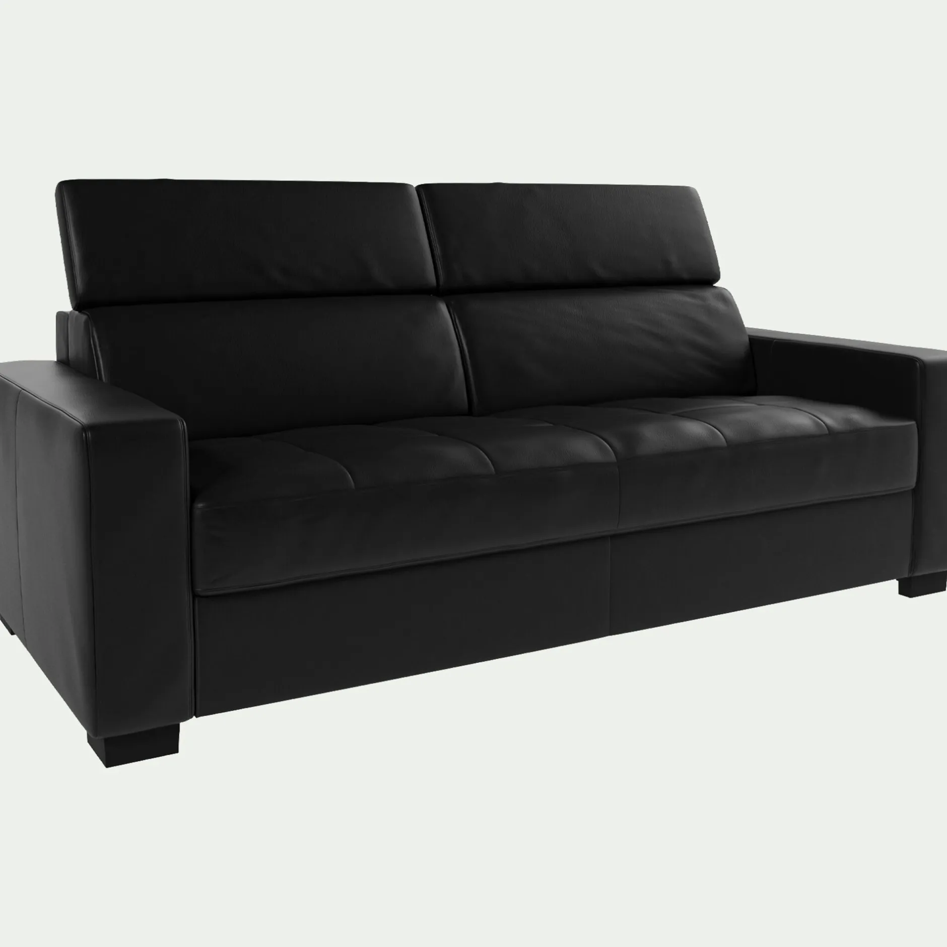 Mauro est une gamme de canapés au style contemporain et d’une grande élégance. Conçu en Italie, il est le fruit d’un travail minutieux et d’un savoir-faire unique. Ce canapé 3 places en cuir noir, arborant de larges accoudoirs et des têtières relevables, vous procurent un confort d’assise incomparable et vous invite à savourer d’agréables moments de détente. Convertible, il vous permet de pouvoir accueillir familles et amis sur son matelas Bultex. Un meuble de fabrication européenne qui sera la pièce maîtresse de votre salon va et sublimera votre décoration d’intérieur.
