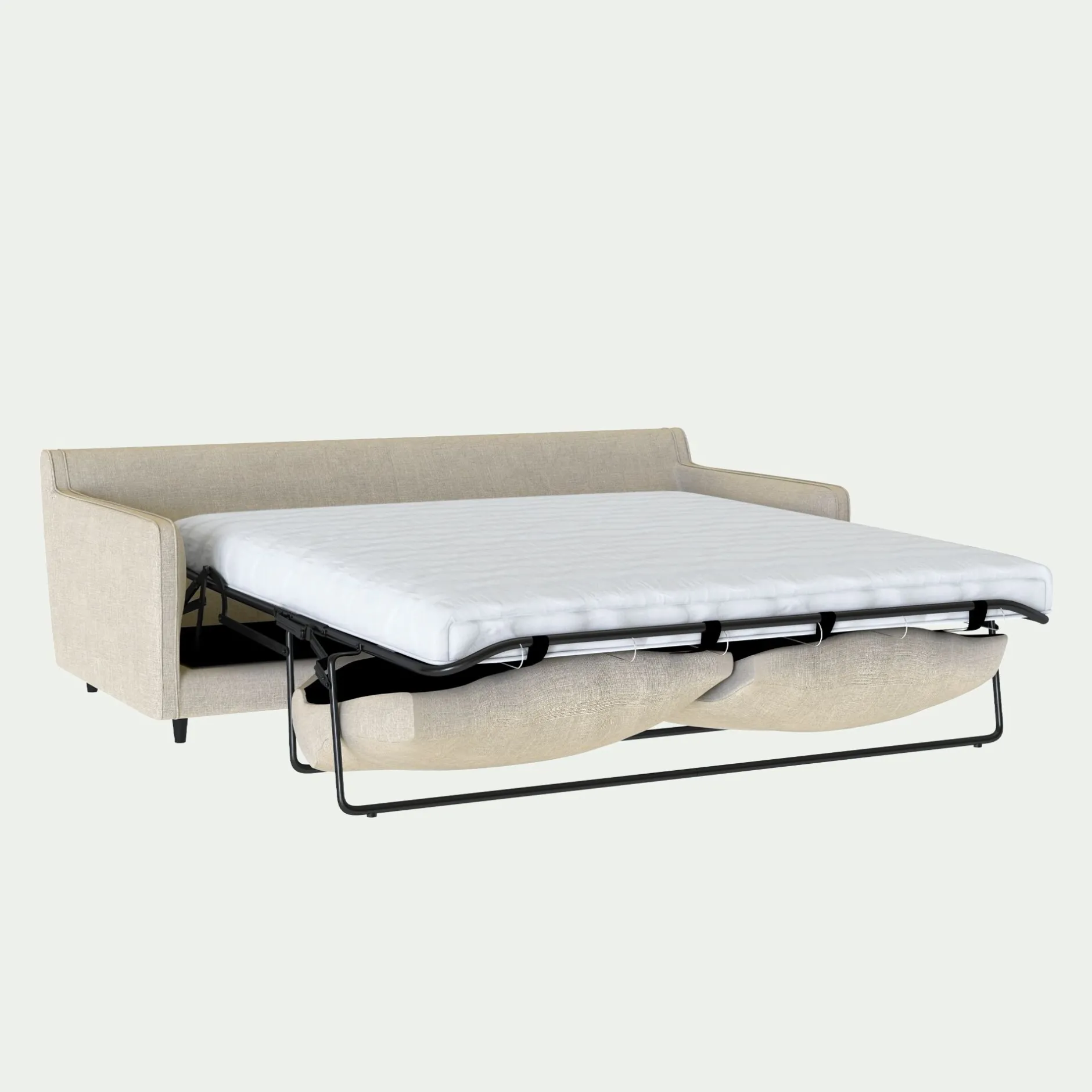 Couchage : Sommier électro-soudé et sangles élastiques. Matelas Bultex 160×185 cm, Densité 35kg/m3. Couchage L.220 x P.230 cm.
