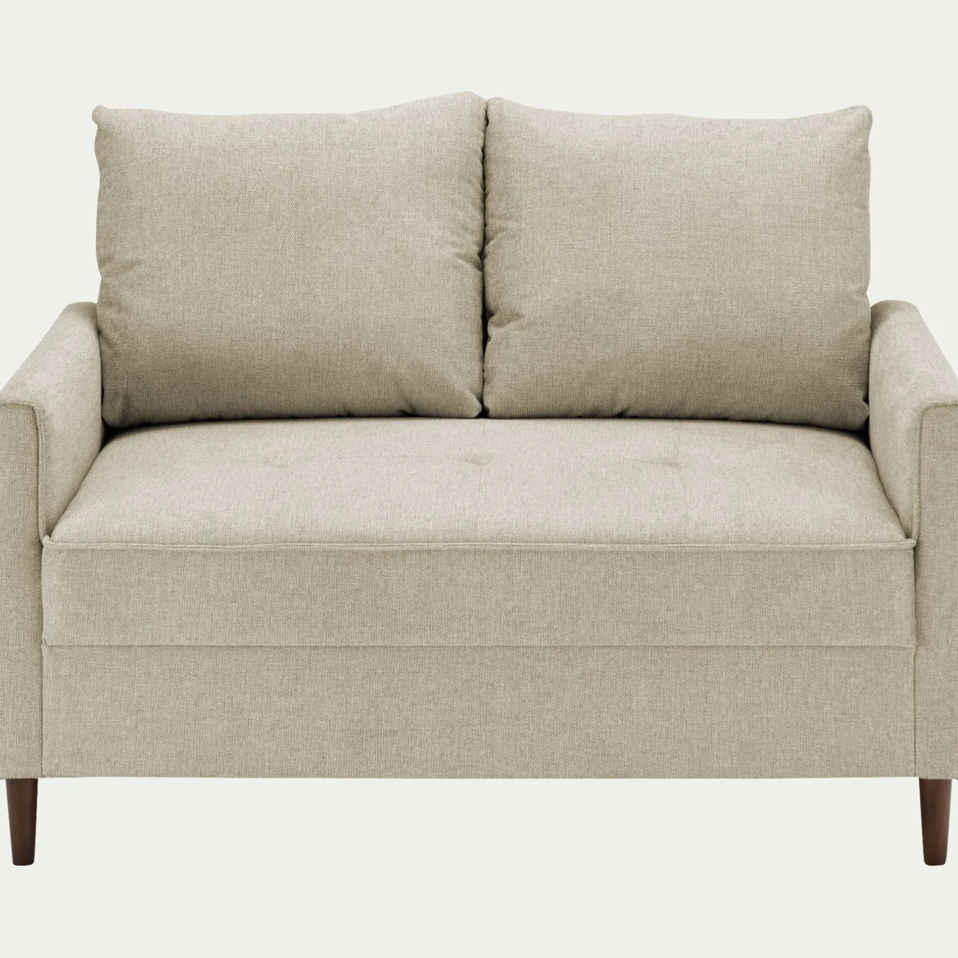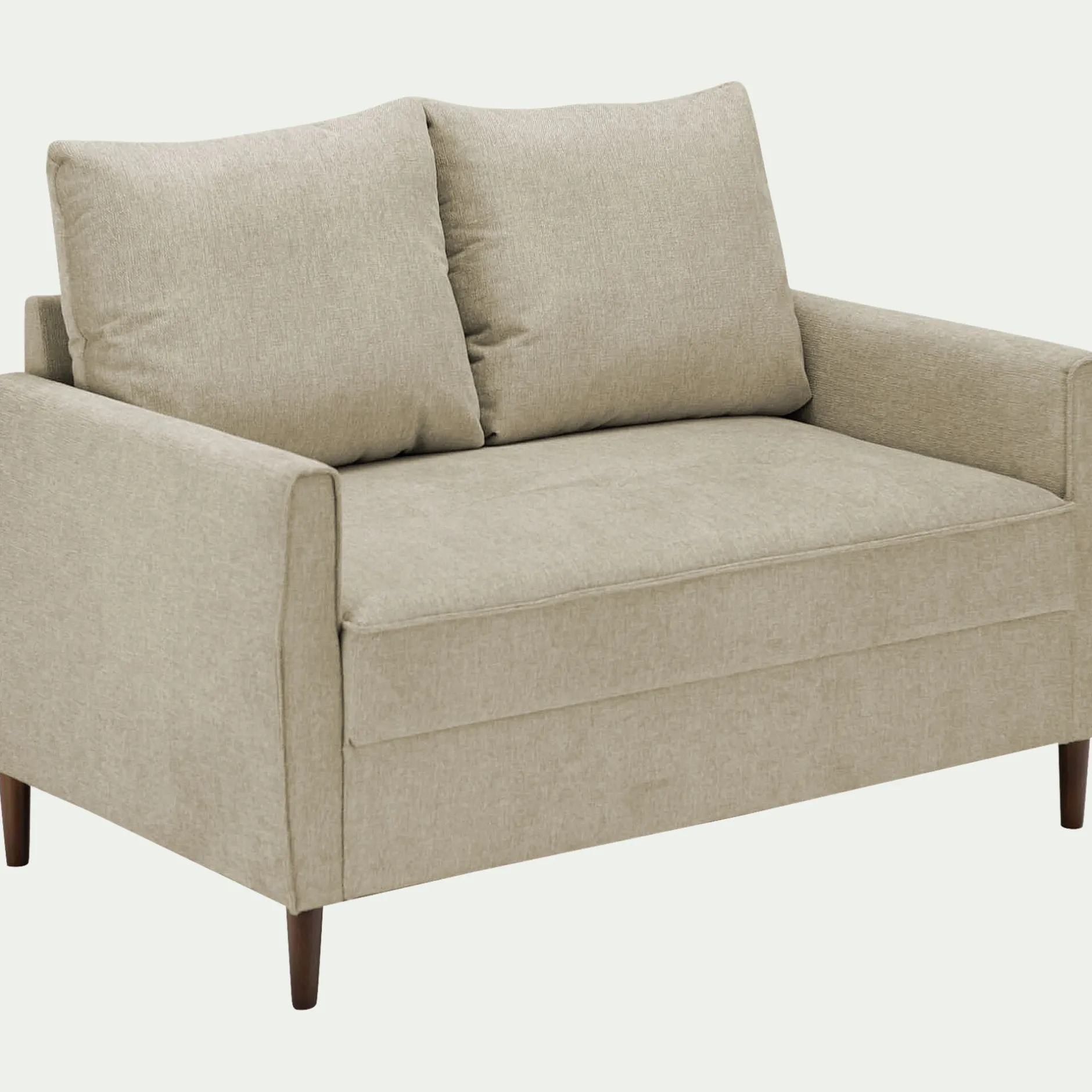 Pensé pour s’adapter à chaque intérieur, ce canapé 2 places permet de vous détendre sans prendre une grande place dans la pièce, il se place selon les envies et l’agencement de votre intérieur. Sa structure en bois accueille une assise en mousse généreuse, complétée par trois coussins de dos qui offrent un soutien optimal aux lombaires et aux épaules. Son revêtement en tissu beige, à la fois profond et naturel, habille ce canapé d’une élégance intemporelle. Il repose sur des pieds en bois de hêtre qui renforcent son allure chaleureuse et naturelle. Compact avec ces 132 cm de long, ce canapé 2 places fabriqué en Roumanie est idéal pour conjuguer style et confort au quotidien, même dans un petit salon.