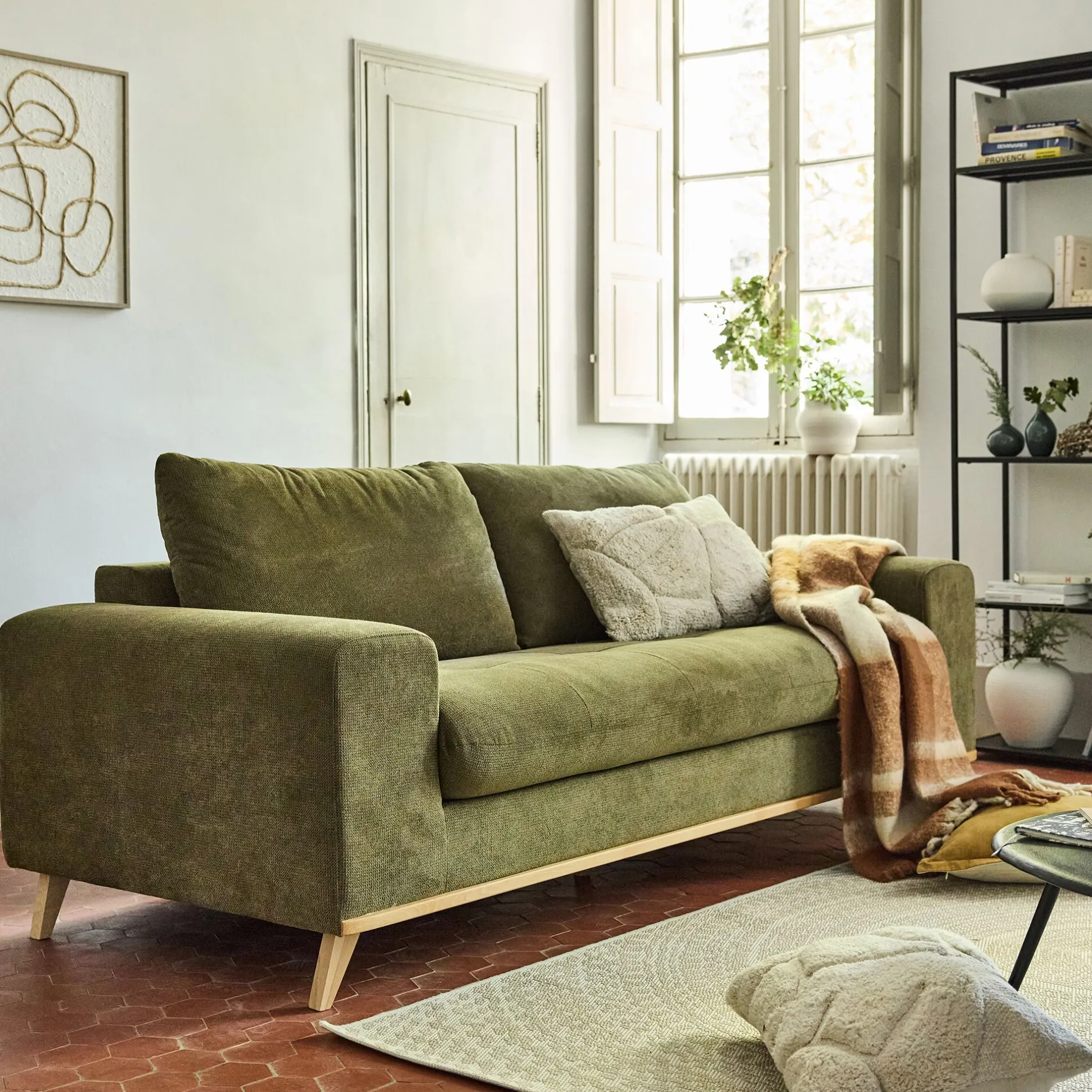 Le canapé 3 places Capia allie confort, style et praticité. Ce canapé est alors revêtu d’un tissu crown vert cèdre, profond et élégant, il offre une assise spacieuse pour 3 personnes. Son tissage de couleur verte apporte douceur et résistance, parfait pour une utilisation quotidienne. Son design repose sur une structure en pin massif et des pieds en hêtre massif, gage de solidité et de durabilité. Les coussins de dos déhoussables facilitent l’entretien. Une fabrication française qui conjugue esthétique et fonctionnalité.