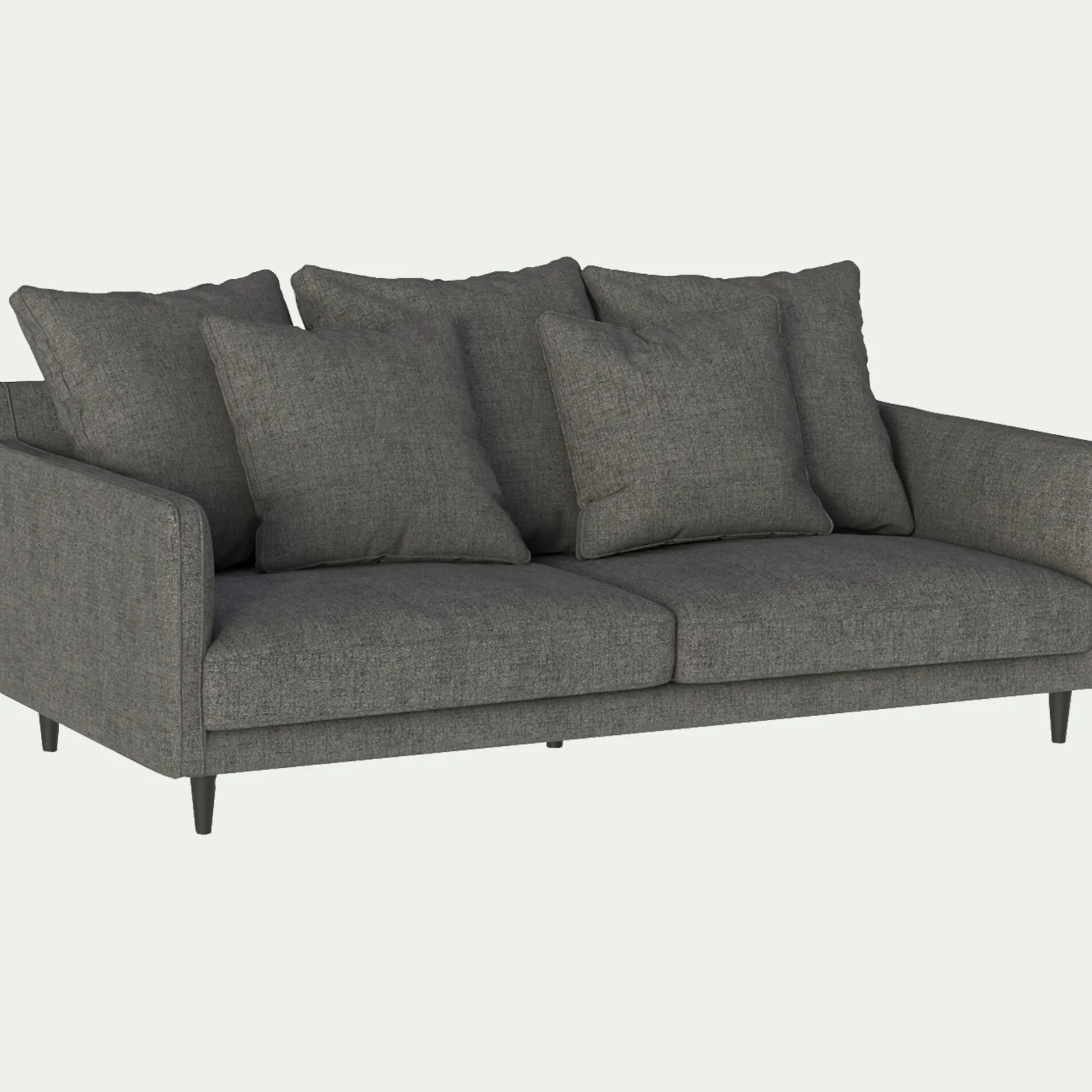Assise et dossier : Garnissage assise en mousse polyuréthane densité 30kg/m3 et couette en fibre polyester. 3 coussins 60x60cm et 2 coussins 50x50cm garnissage plumes d’oie et fibres polyester.