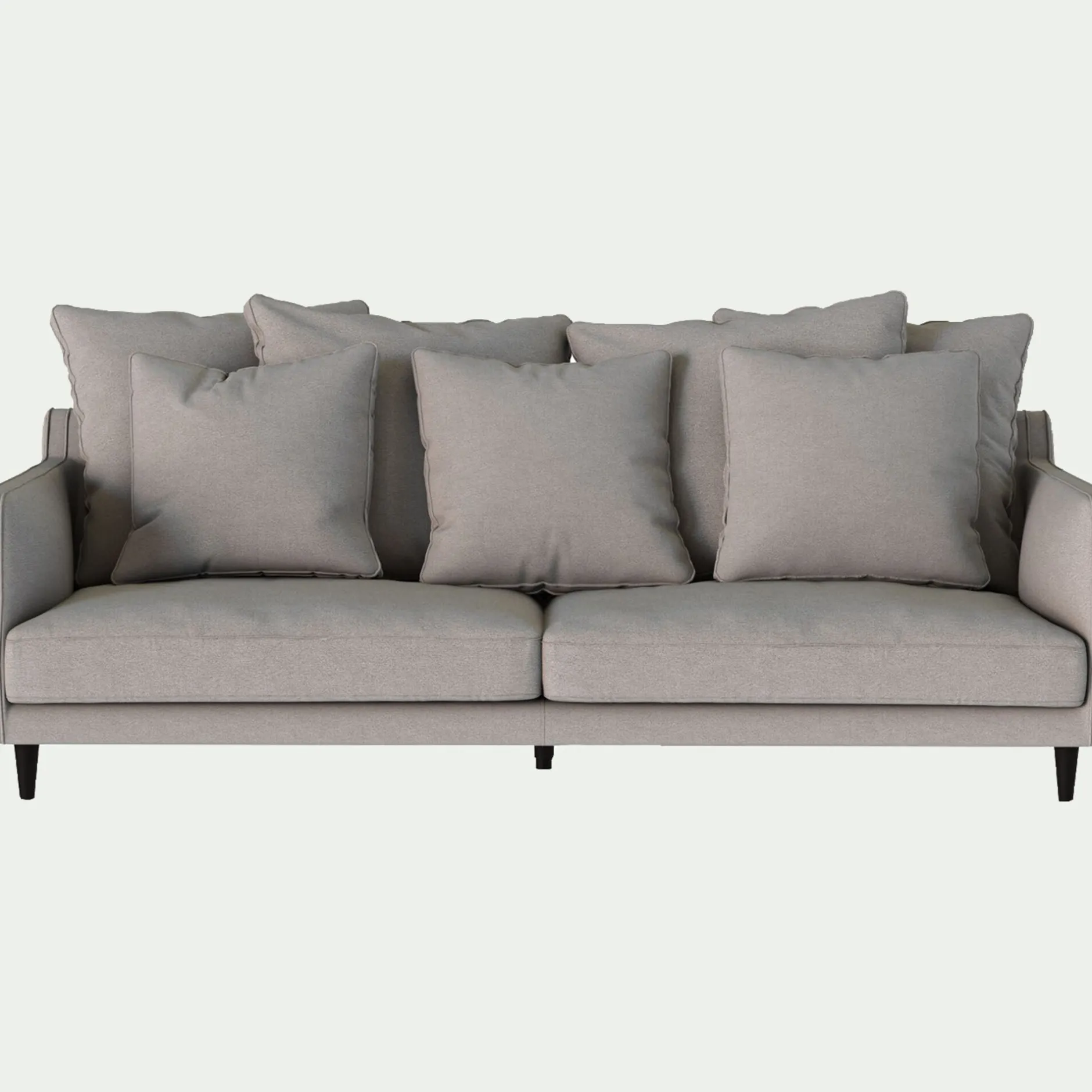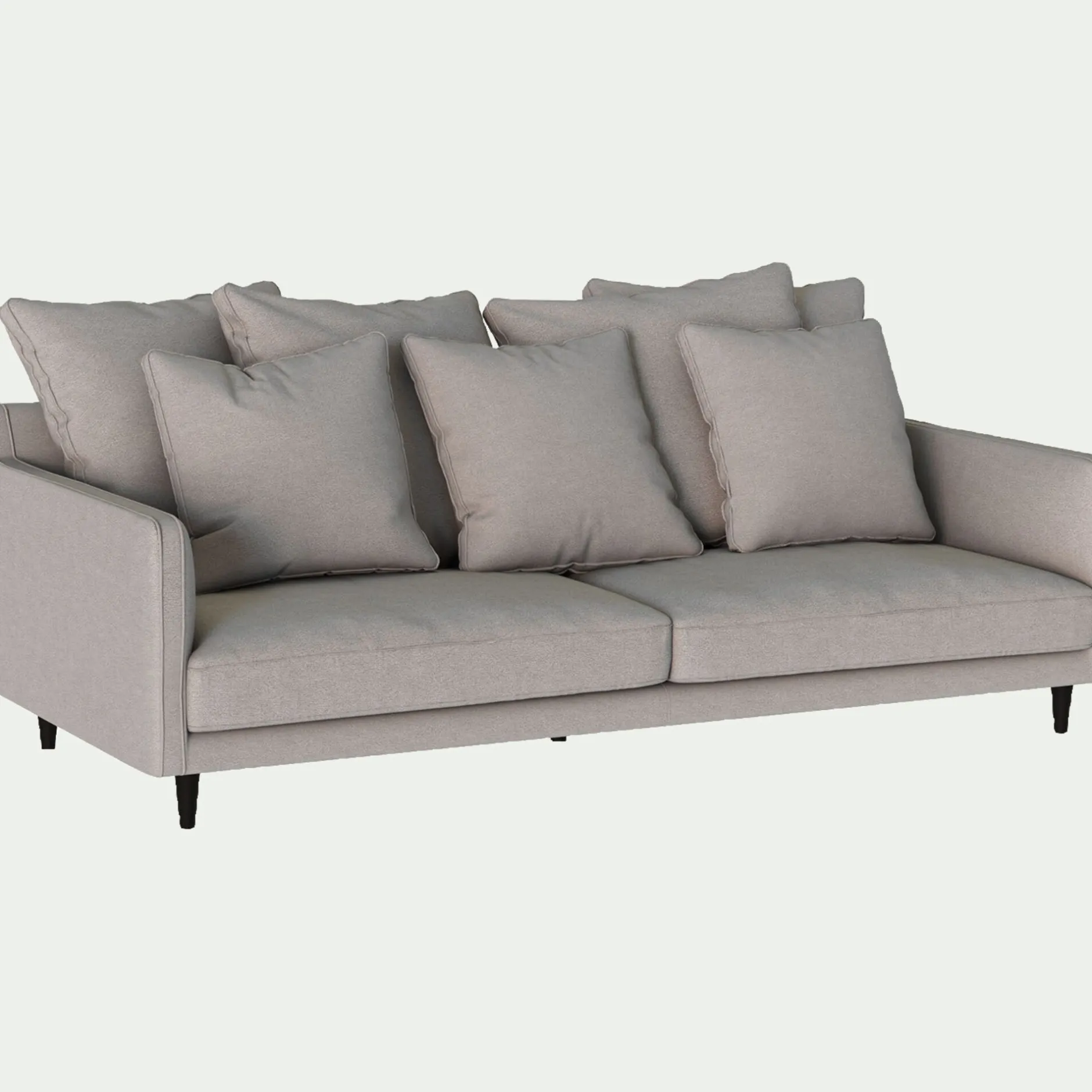 Assise et dossier : Assise en mousse polyuréthane densité 30 kg/m3 et couette en fibre polyester. 4 coussins 60x60cm et 3 coussins 50x50cm garnissage plumes d’oie et fibres .