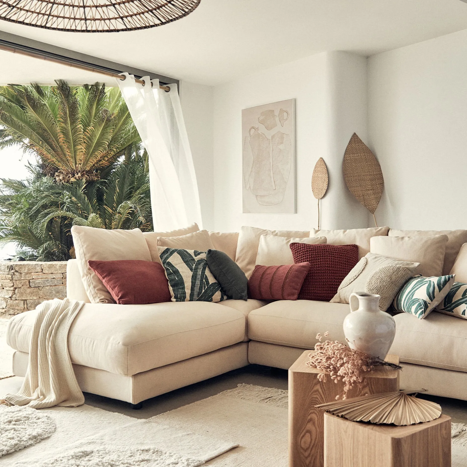 Assise et dossier : mousse polyuréthane densité de 30 kg/m3 et couette en fibre polyester. 7 coussins dossier 60×60: Plumes d’oie et fibre polyester. 4 coussins 50×50: Plumes d’oie et fibre polyester.