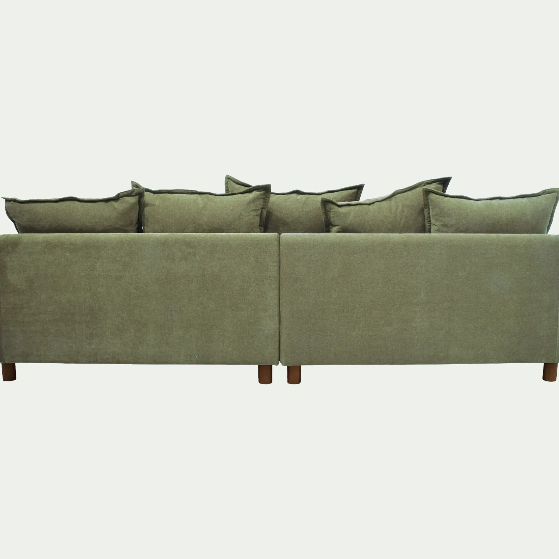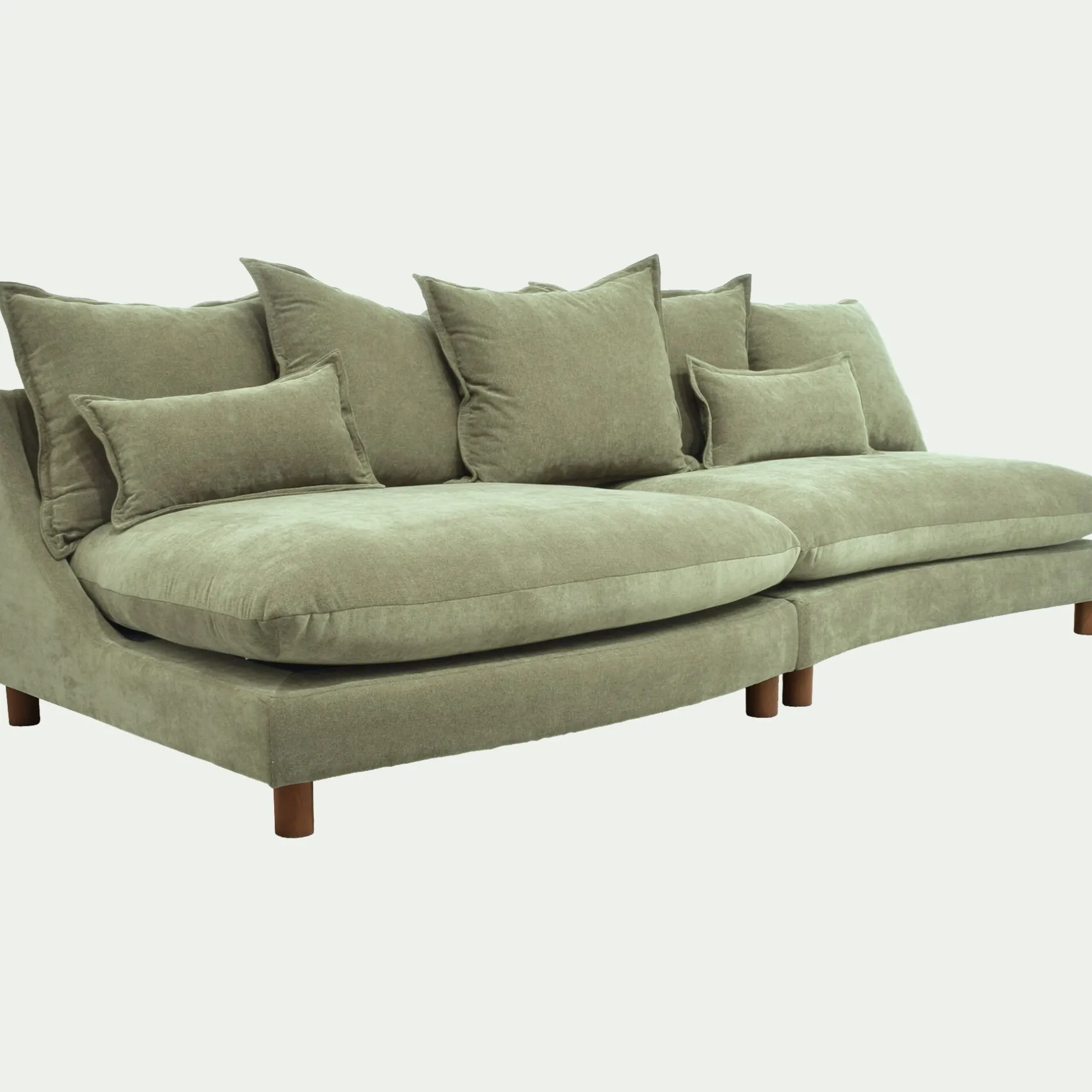 Ce grand canapé modulable séduit par ses lignes généreuses et son design singulier, entre modernité et confort. Entièrement convertible, il se compose de deux modules que l’on peut rapprocher pour former un couchage d’appoint, idéal pour les moments de détente prolongés. Revêtu d’un tissu vert eucalyptus, il apporte une note de fraîcheur douce et naturelle à la pièce. Ses nombreux coussins renforcent l’esprit cocooning et invitent à s’y lover. Fabriqué en France, dans des ateliers situés près de Bourges, ce canapé reflète le savoir-faire d’artisans passionnés. Une pièce de caractère, conçue avec soin, qui incarne l’élégance à la française.
