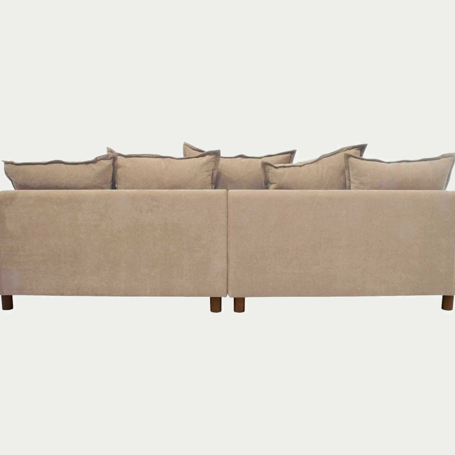 Ce grand canapé modulable séduit par ses lignes généreuses et son design singulier, entre modernité et confort. Entièrement convertible, il se compose de deux modules que l’on peut rapprocher pour former un couchage d’appoint, idéal pour les moments de détente prolongés. Revêtu d’un tissu beige ivoire, il apporte de la douceur pour faire du salon un cocon aux accents chic. Ses nombreux coussins renforcent l’esprit cocooning et invitent à s’y lover. Fabriqué en France, dans des ateliers situés près de Bourges, ce canapé reflète le savoir-faire d’artisans passionnés. Une pièce de caractère, conçue avec soin, qui incarne l’élégance à la française.