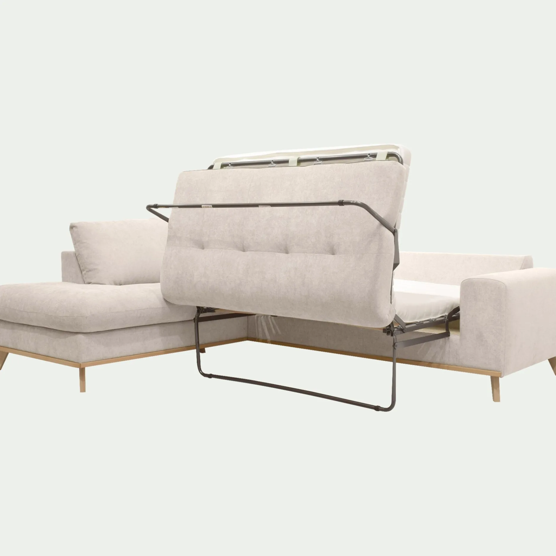 Le canapé d’angle convertible Capia allie confort, style et praticité. De jour, il offre une assise spacieuse pour 5 personnes grâce à son angle à gauche. Ce canapé est alors revêtu d’un tissu Storm dans notre coloris beige roucas, doux et lumineux. Son tissage certifié Oeko-Tex apporte douceur et résistance, parfait pour une utilisation quotidienne. Le soir, il se transforme en un couchage d’appoint de 120×190 cm grâce à un mécanisme d’ouverture rapide et facile, intégrant un sommier et un matelas pour un confort optimal. Son design repose sur une structure en pin massif et des pieds en hêtre massif, gage de solidité et de durabilité. Les coussins de dos déhoussables facilitent l’entretien. Une fabrication française qui conjugue esthétique et fonctionnalité.