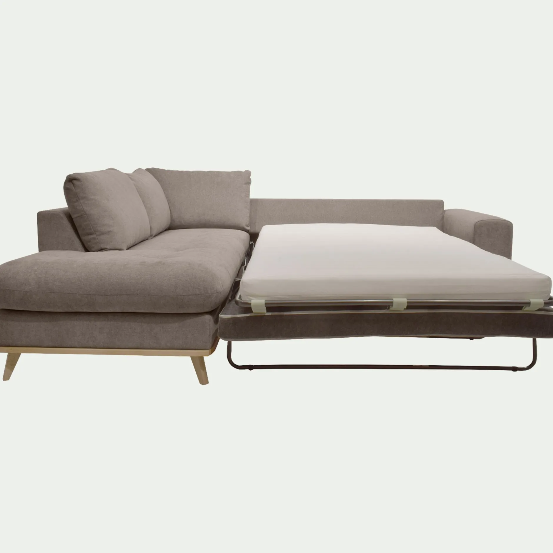 Le canapé d’angle convertible Capia allie confort, style et praticité. De jour, il offre une assise spacieuse pour 5 personnes grâce à son angle à gauche. Ce canapé est alors revêtu d’un tissu Storm dans notre coloris taupe, intemporel et polyvalent. Son tissage certifié Oeko-Tex apporte douceur et résistance, parfait pour une utilisation quotidienne. Le soir, il se transforme en un couchage d’appoint de 120×190 cm grâce à un mécanisme d’ouverture rapide et facile, intégrant un sommier et un matelas pour un confort optimal. Son design repose sur une structure en pin massif et des pieds en hêtre massif, gage de solidité et de durabilité. Les coussins de dos déhoussables facilitent l’entretien. Une fabrication française qui conjugue esthétique et fonctionnalité.