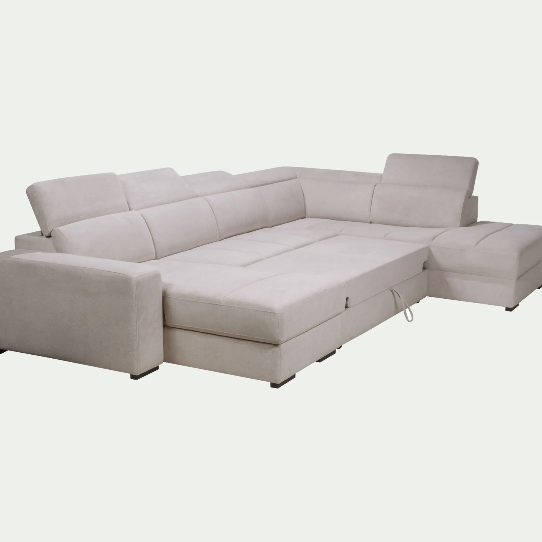 Un superbe canapé en U en tissu d’une couleur beige, idéal pour un grand salon. Ce canapé vous offre un espace détente spacieux et confortable avec son assise capitonnée et ses têtières relevables qui accompagneront tous vos mouvements. Convertible, il met à votre disposition un couchage d’appoint de 130×200 cm avec un matelas de 10 cm d’épaisseur qui se déploie aisément. Pratique et astucieux grâce à son coffre et sa méridienne gauche, ce grand canapé allie fonctionnalité, style et confort.