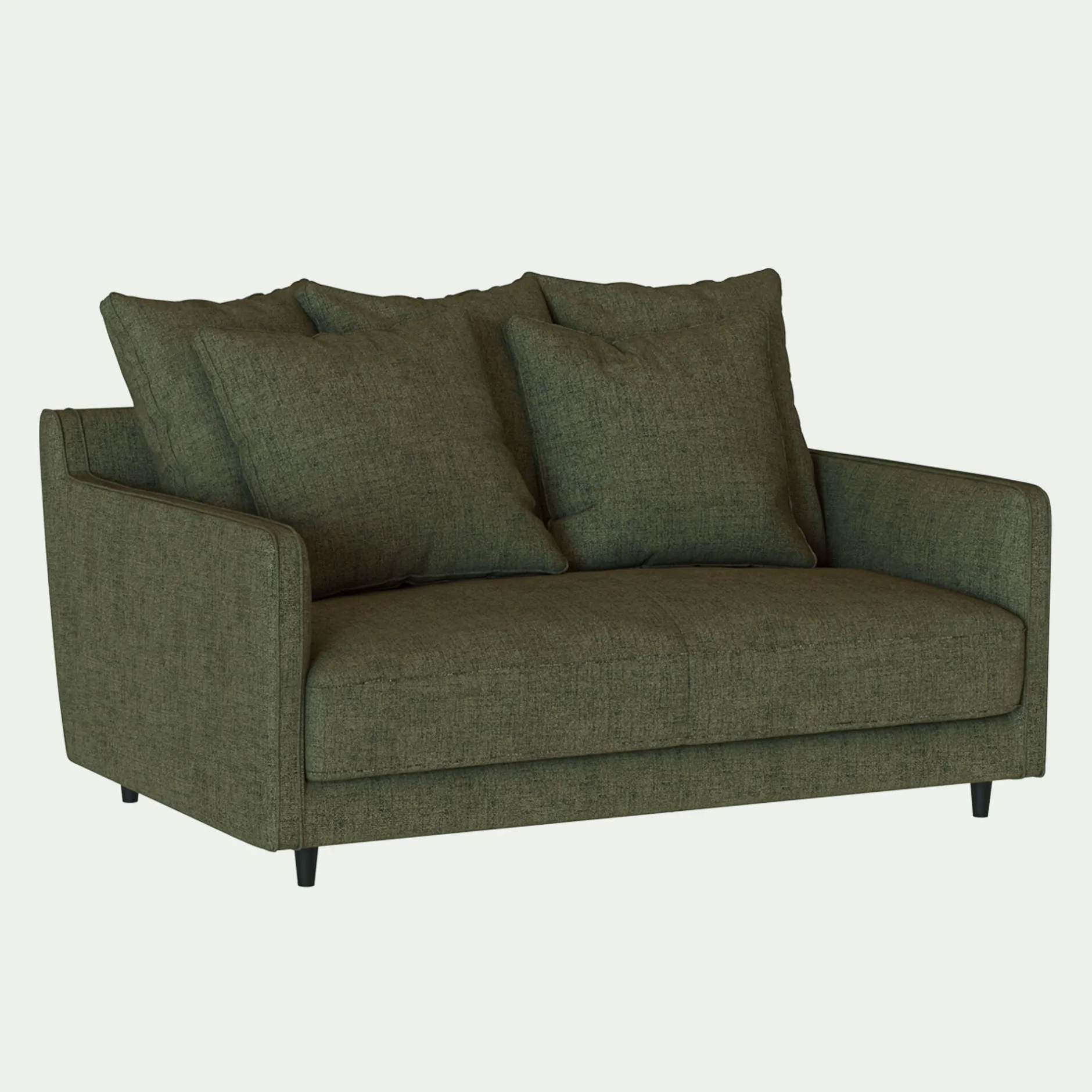 Assise et dossier : Assise en mousse polyuréthane densité 30kg/m3 et couette en fibre polyester. Coussins dossier garnissage plumes d’oies et fibres polyester, 3 coussins de 60x60cm, 2 coussins de 50x50cm.