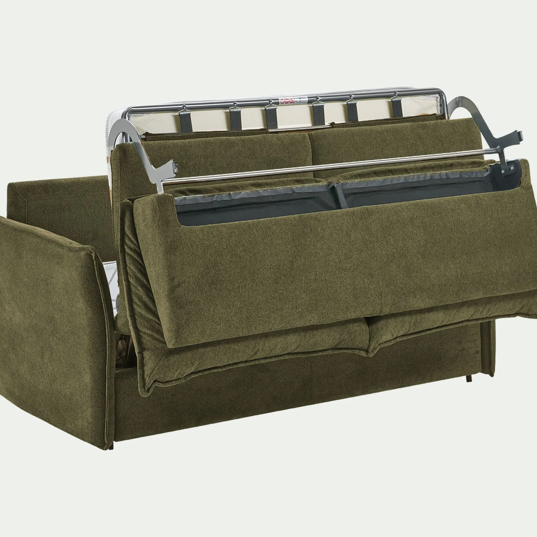 Le canapé Moya offre un soutien optimal adapté à chaque partie du corps. Ce canapé 3 places convertible à la fabrication italienne, confectionné à partir du savoir faire local, vous permet de vous détendre dans une pièce hautement qualitative. Le soir, dépliez votre canapé et transformez-le en un lit au couchage 140×195 cm d’une densité de 25kg/m3 qui vous permettra d’accueillir famille et amis. Très confortable, ce canapé peut servir de couchage quotidien. Son mécanisme métallique vous permet de le déplier en quelques secondes sans enlever ses coussins. Ce canapé en tissu, avec sa couleur vert cèdre et son liseré décoratif, apportera de l’élégance à votre salon.