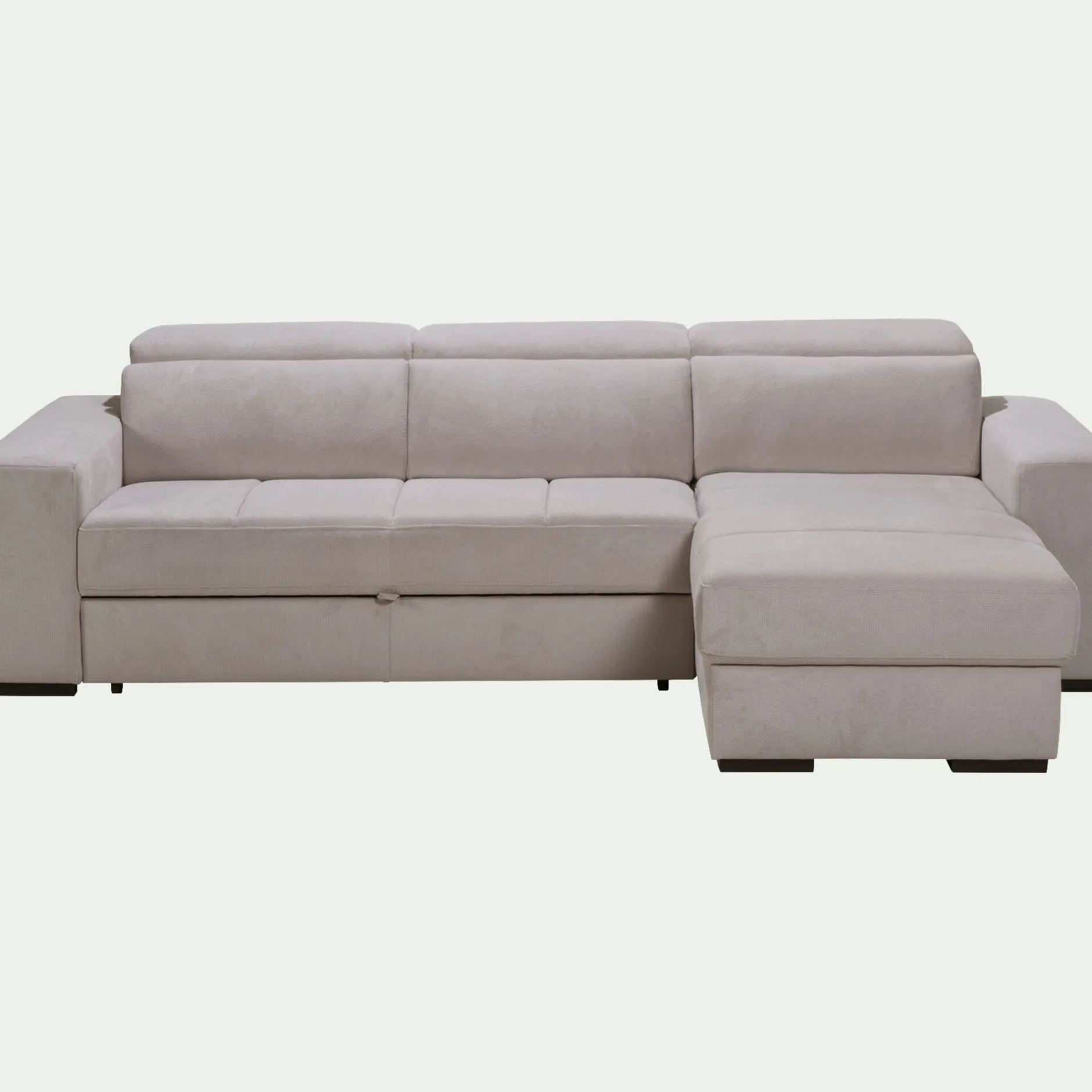Un superbe canapé d’angle réversible en tissu d’un coloris beige, idéal pour un grand salon. Ce canapé vous offre un espace détente spacieux et confortable avec son assise capitonnée et ses têtières relevables qui accompagneront tous vos mouvements. Convertible, il met à votre disposition un couchage occasionnel de 130×200 cm. Pratique et astucieux, ce grand canapé vous propose également un coffre de rangement sous la méridienne. Vous avez ainsi un espace de rangement supplémentaire à disposition pour mettre vos plaids et coussins de façon pratique. Optez sans hésiter pour ce canapé qui allie fonctionnalité, style et confort.