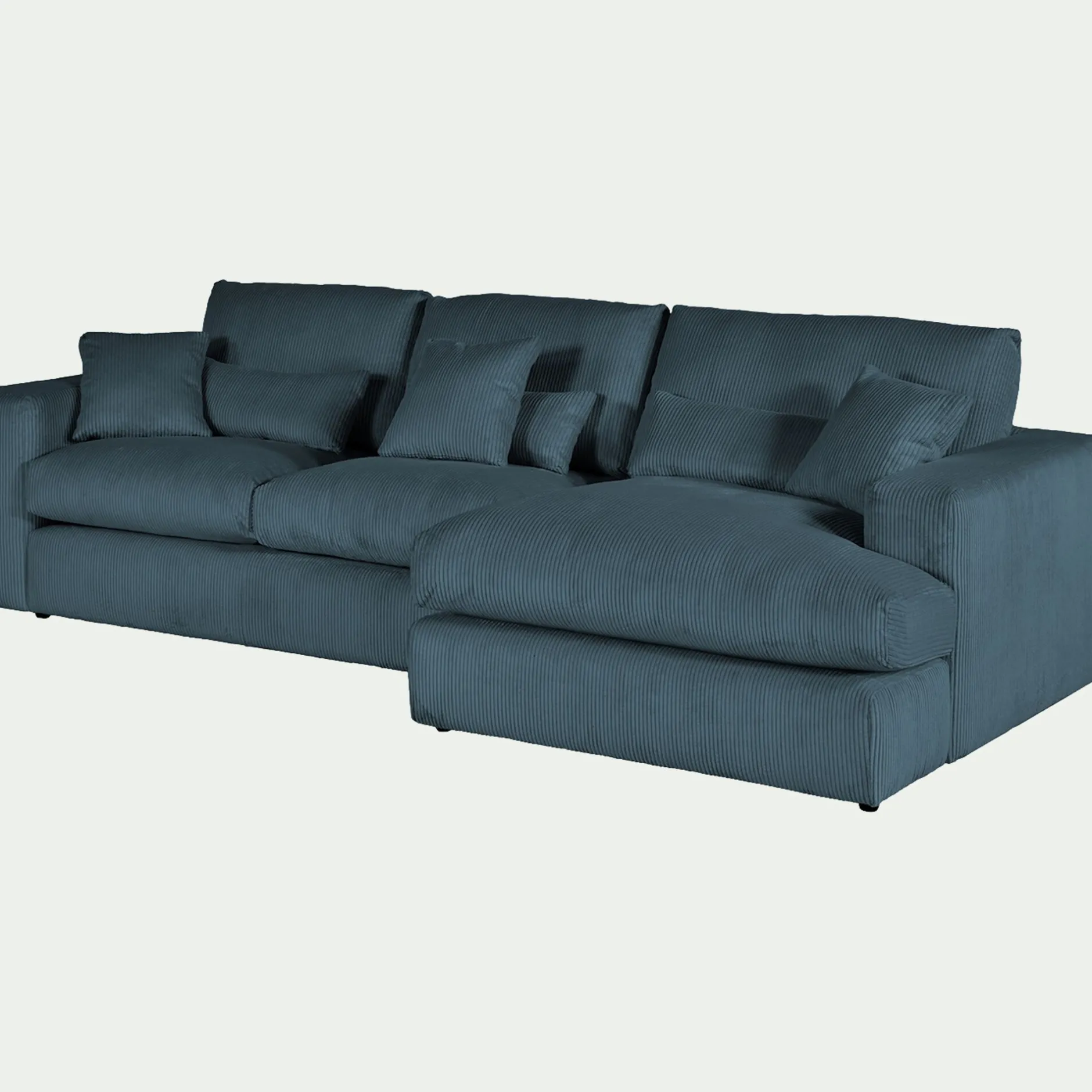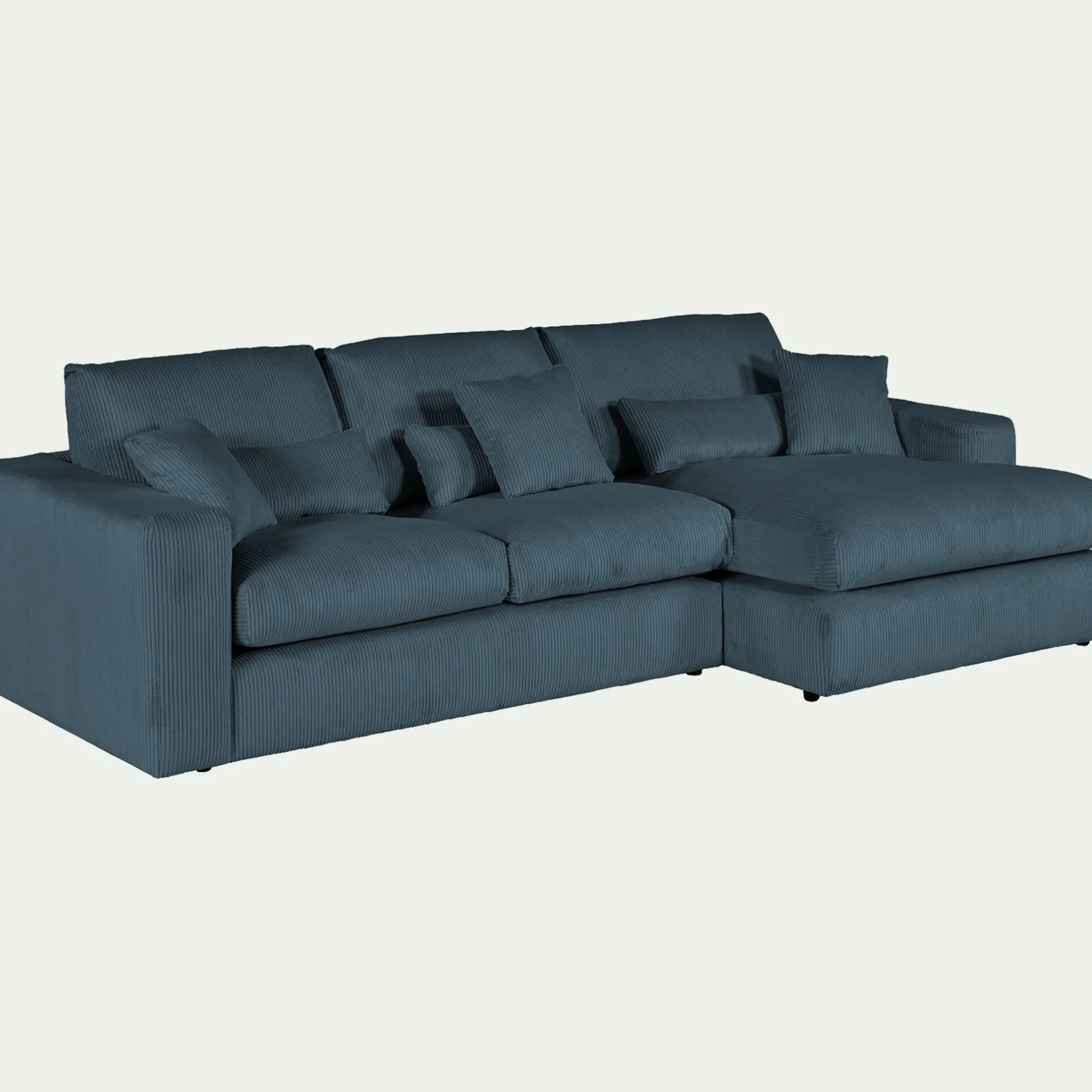 Avec son format 3 places et son angle à droite, ce canapé d’angle est une invitation aux moments partagés. Son revêtement en velours côtelé, à la fois doux et résistant, enveloppe l’espace d’une chaleur réconfortante. Son coloris bleu, intemporel, s’harmonise avec tous les styles d’intérieur. Pensé pour le confort, ce canapé fixe se compose d’une assise spacieuse, d’un dossier accueillant et de coussins déhoussables pour un entretien facilité. Six coussins décoratifs viennent parfaire l’ensemble, ajoutant une touche cosy. Un canapé idéal pour des instants de détente en famille ou entre amis.