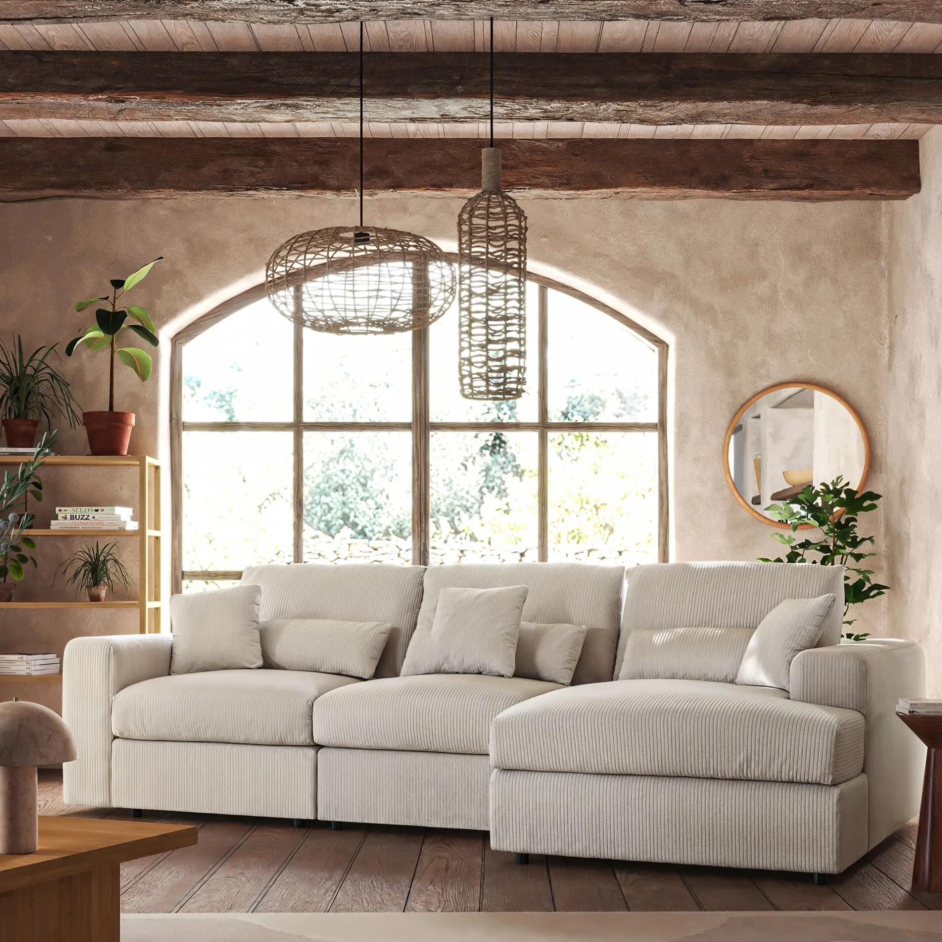 Avec son petit angle à droite, ce canapé d’angle est une invitation aux moments partagés. Son revêtement en velours côtelé, à la fois doux et résistant, enveloppe l’espace d’une chaleur réconfortante. Son coloris beige roucas, intemporel, s’harmonise avec tous les styles d’intérieur. Pensé pour le confort, ce canapé fixe se compose d’une assise spacieuse, d’un dossier accueillant et de coussins déhoussables pour un entretien facilité. Des coussins décoratifs viennent parfaire l’ensemble, ajoutant une touche cosy. Un canapé idéal pour des instants de détente en famille ou entre amis.