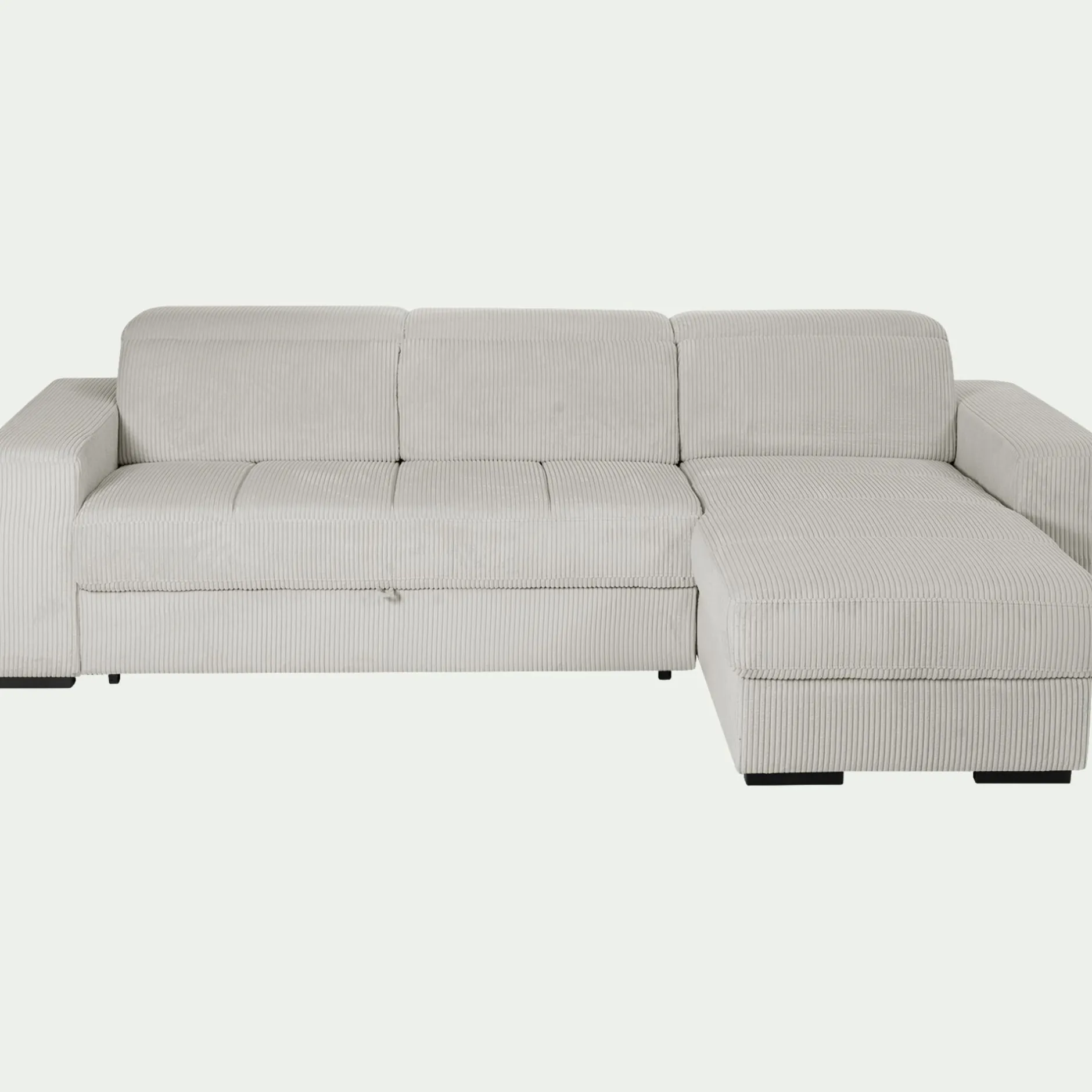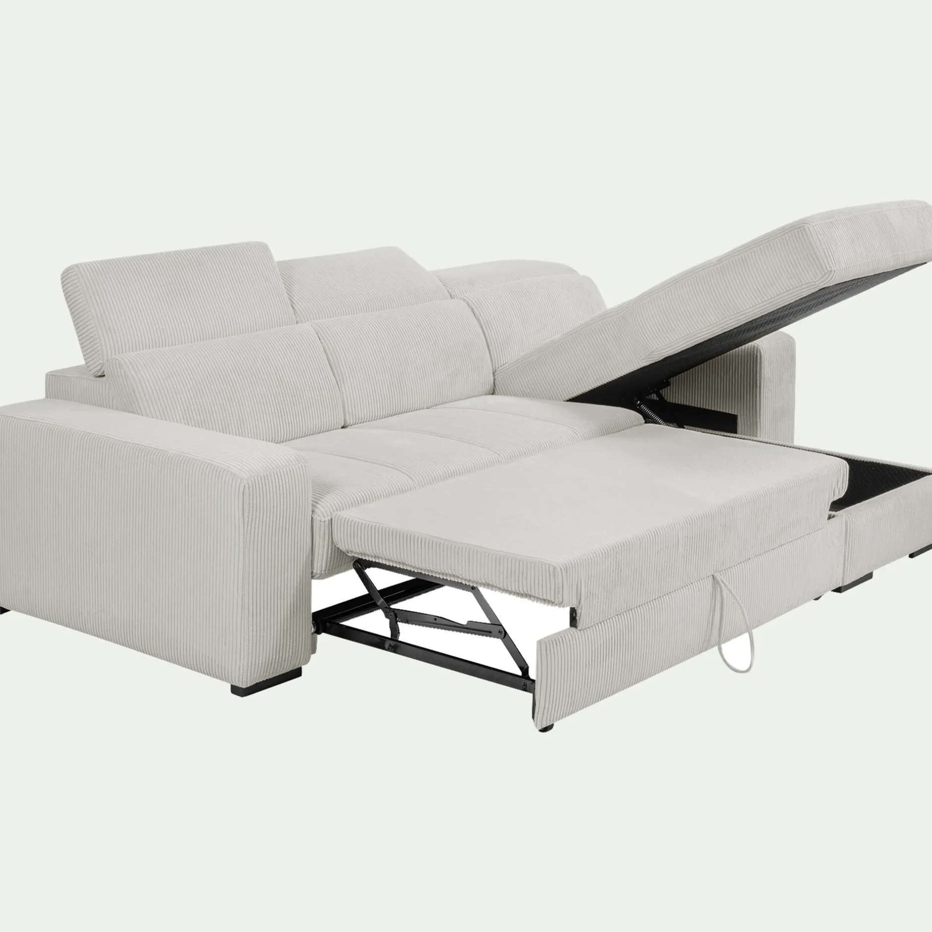 Ce canapé d’angle réversible, en tissu côtelé beige roucas, conjugue élégance contemporaine et fonctionnalité. Sa silhouette généreuse s’adapte à tous les espaces grâce à son angle modulable à droite ou à gauche. L’assise spacieuse, rehaussée de têtières ajustables, invite à des instants de détente tout en soutenant parfaitement la nuque, selon les envies. Convertible en couchage d’appoint 130×200 cm, ce canapé se transforme en lit en un clin d’œil pour accueillir famille ou amis. Son coffre dissimulé sous la méridienne offre un espace de rangement pratique pour les coussins ou les plaids. Avec son tissu doux à grosses côtes, à la fois chaleureux et moderne, ce canapé est une pièce aussi confortable que maline, idéale pour un grand séjour vivant et accueillant.
