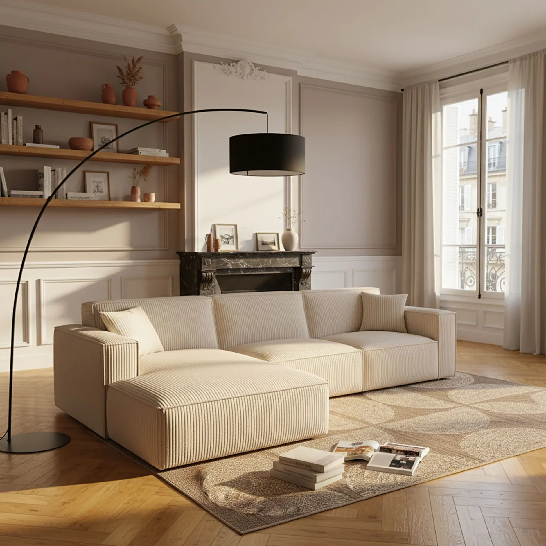 Le canapé d’angle gauche Kubo transformera votre intérieur tout en vous offrant un confort absolu pour vos moments de détente grâce à sa grande méridienne. Ses lignes rectangulaires confèrent une touche de modernité à votre salon, ajoutant une note contemporaine à votre décoration. Conçu en Ukraine, ce canapé fixe allie qualité et savoir-faire. Son assise généreuse et moelleuse vous permettra d’accueillir famille et amis pour des moments de partage conviviaux. Revêtu d’un velours côtelé dans notre coloris beige, il adoucit votre pièce pour une ambiance chic et actuelle.