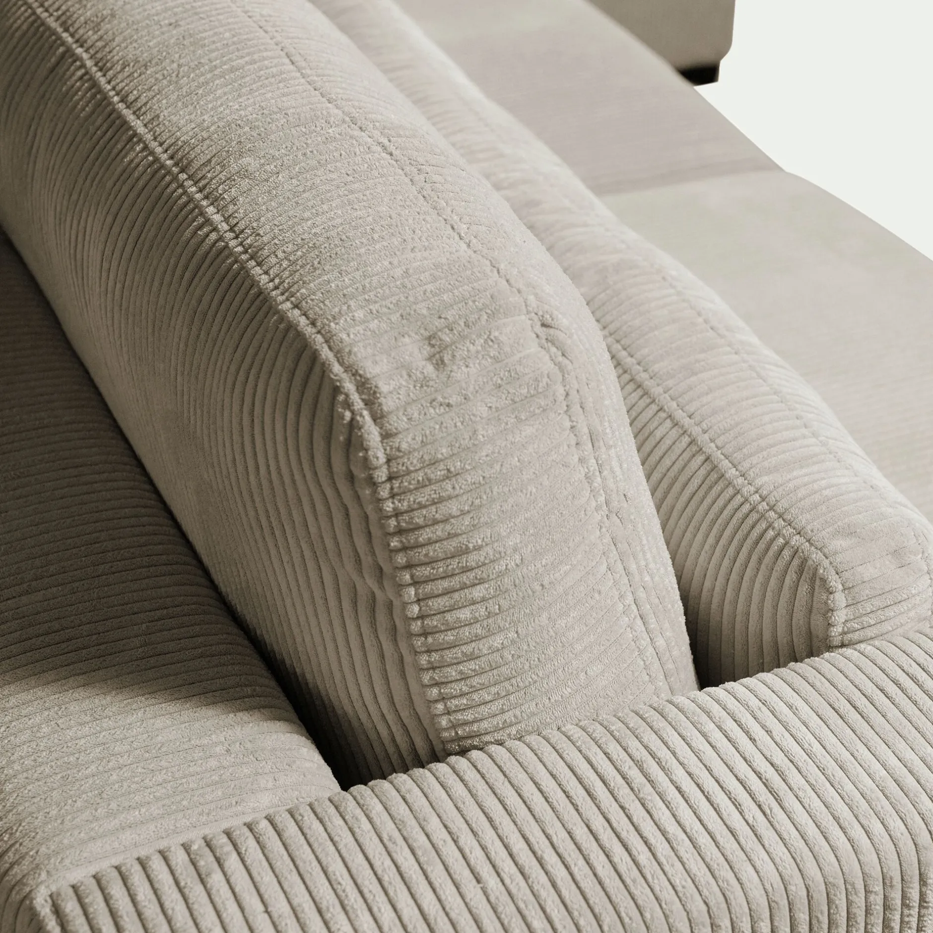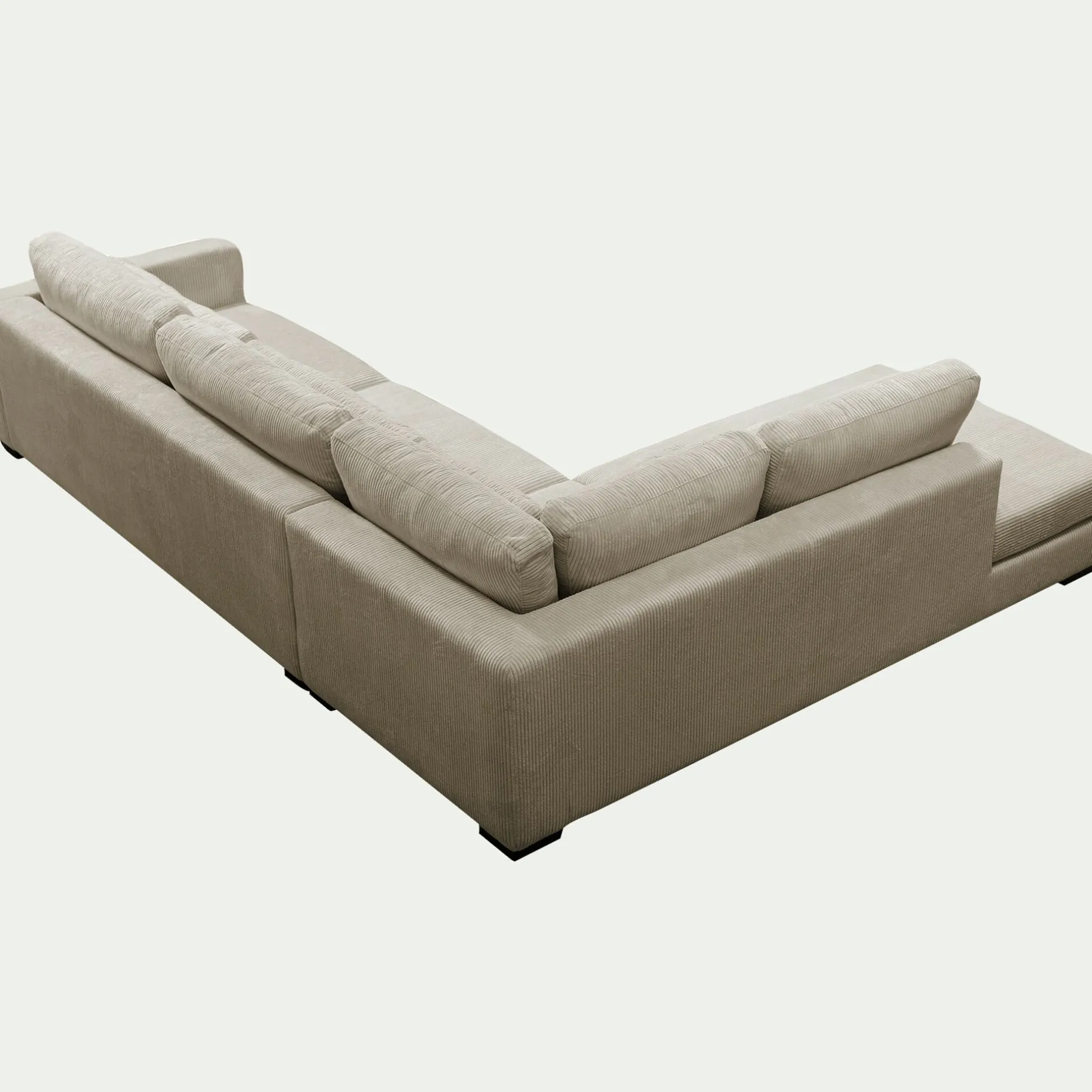 Ce canapé d’angle avec méridienne à gauche transforme le salon en un véritable espace bien-être. Son grand format accueille toute la famille ou permet de s’allonger entièrement pour une détente absolue. Revêtu d’un velours côtelé dans un coloris taupe à la fois naturel et intemporel, il séduit par son toucher doux et soyeux, reflétant la lumière pour une touche de brillance. Son assise profonde repose sur une structure en bois massif et des ressorts qui garantissent un maintien souple et durable. Pratique, ses coussins de dossier et d’assise sont déhoussables pour un entretien facilité. Généreux et élégant, ce grand canapé fixe insuffle du caractère à la pièce et s’impose comme un allié incontournable des instants de détente et de convivialité.