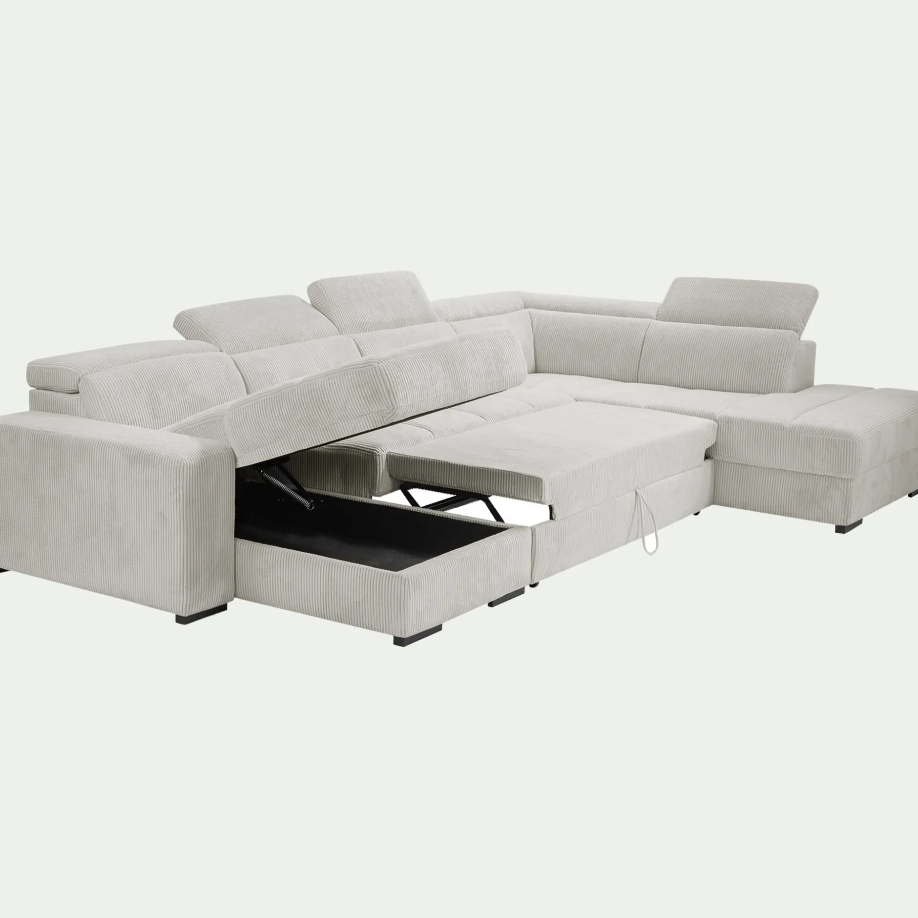 Ce canapé panoramique en tissu côtelé beige roucas est la solution complète pour votre salon. Sa forme en U structure l’espace et offre une capacité d’accueil exceptionnelle. Pensé pour le quotidien, il se transforme facilement en un couchage confortable. Sous sa méridienne se cache un vaste coffre de rangement, idéal pour optimiser votre pièce de vie. Son tissu à grosses côtes, à la fois tendance et résistant, en fait une pièce aussi esthétique que maline. Un véritable canapé 3-en-1, parfait pour les grandes familles et les intérieurs vivants.
