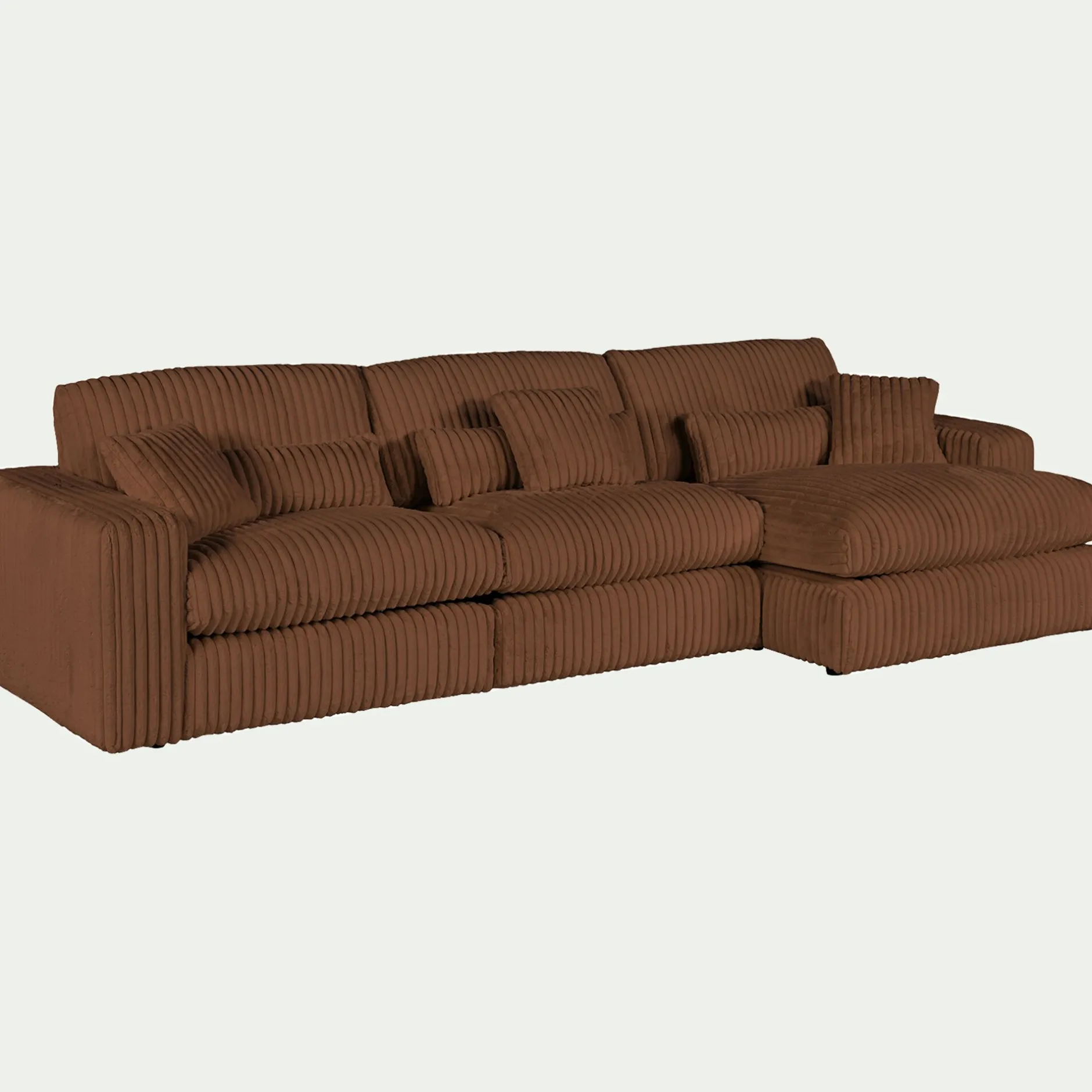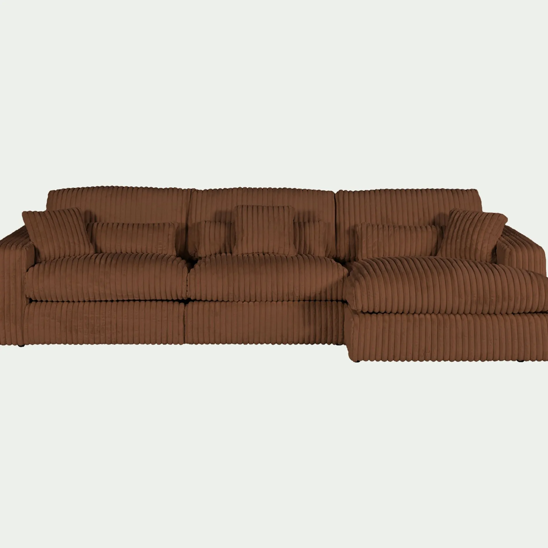 Avec son grand angle droit bien dessiné, ce canapé d’angle invite à la convivialité et au confort. Son revêtement en tissu côtelé, au toucher texturé et chaleureux, apporte du relief à l’espace tout en douceur. Habillé de notre coloris brun rustrel, chaleureux et cocooning, il s’intègre avec élégance dans tous les intérieurs. Ce canapé fixe propose une assise généreuse, un dossier enveloppant et des coussins déhoussables pour un entretien simplifié. Des coussins décoratifs complètent l’ensemble, ajoutant une note cosy à ce canapé pensé pour les moments de détente partagés.