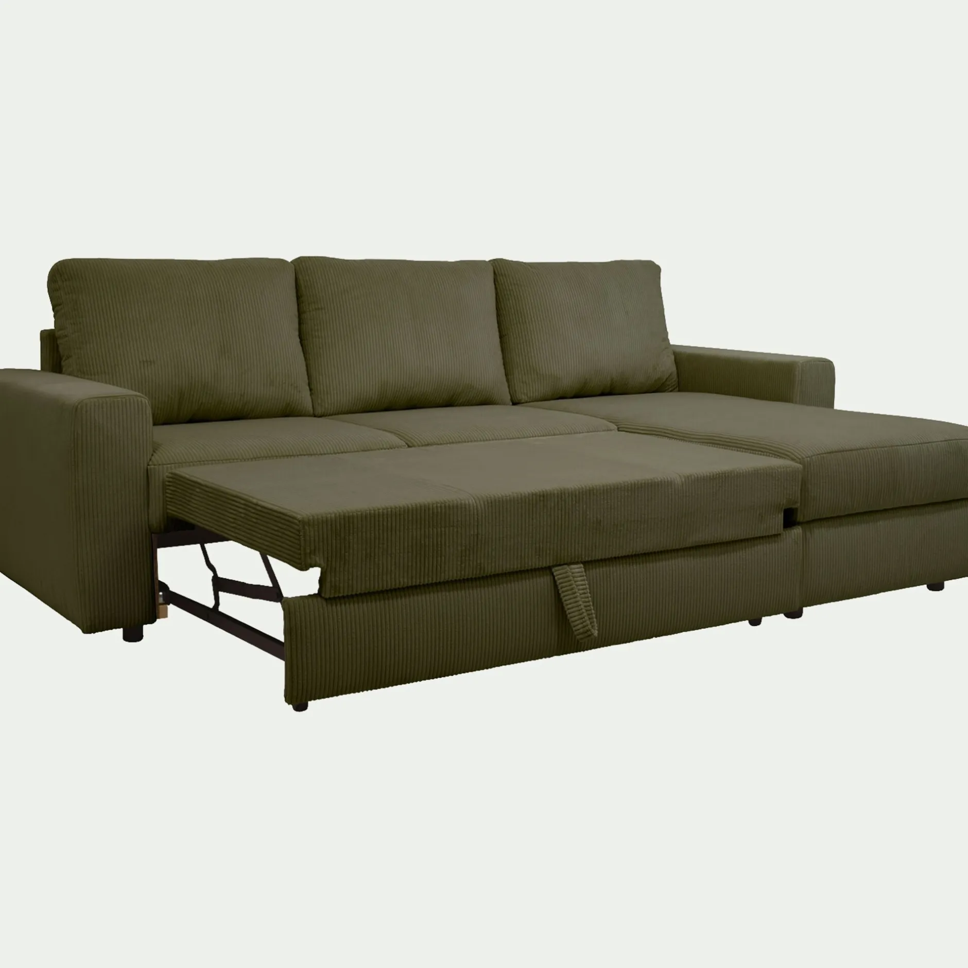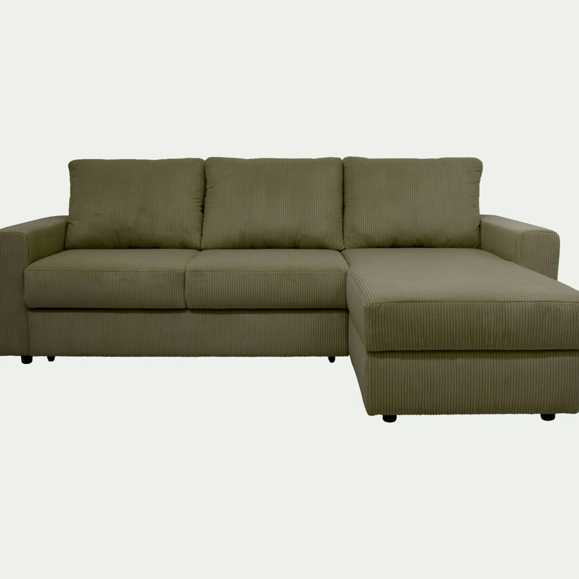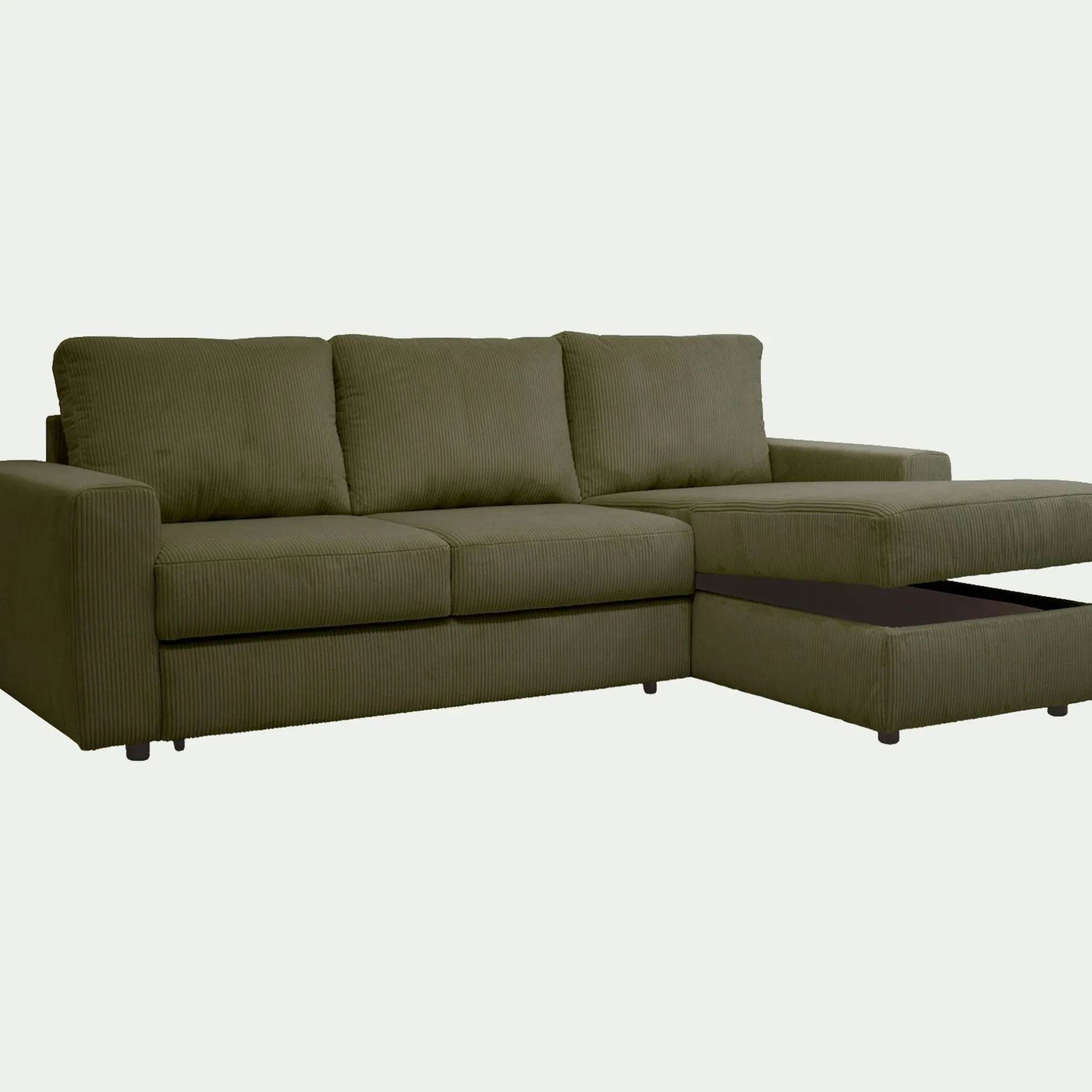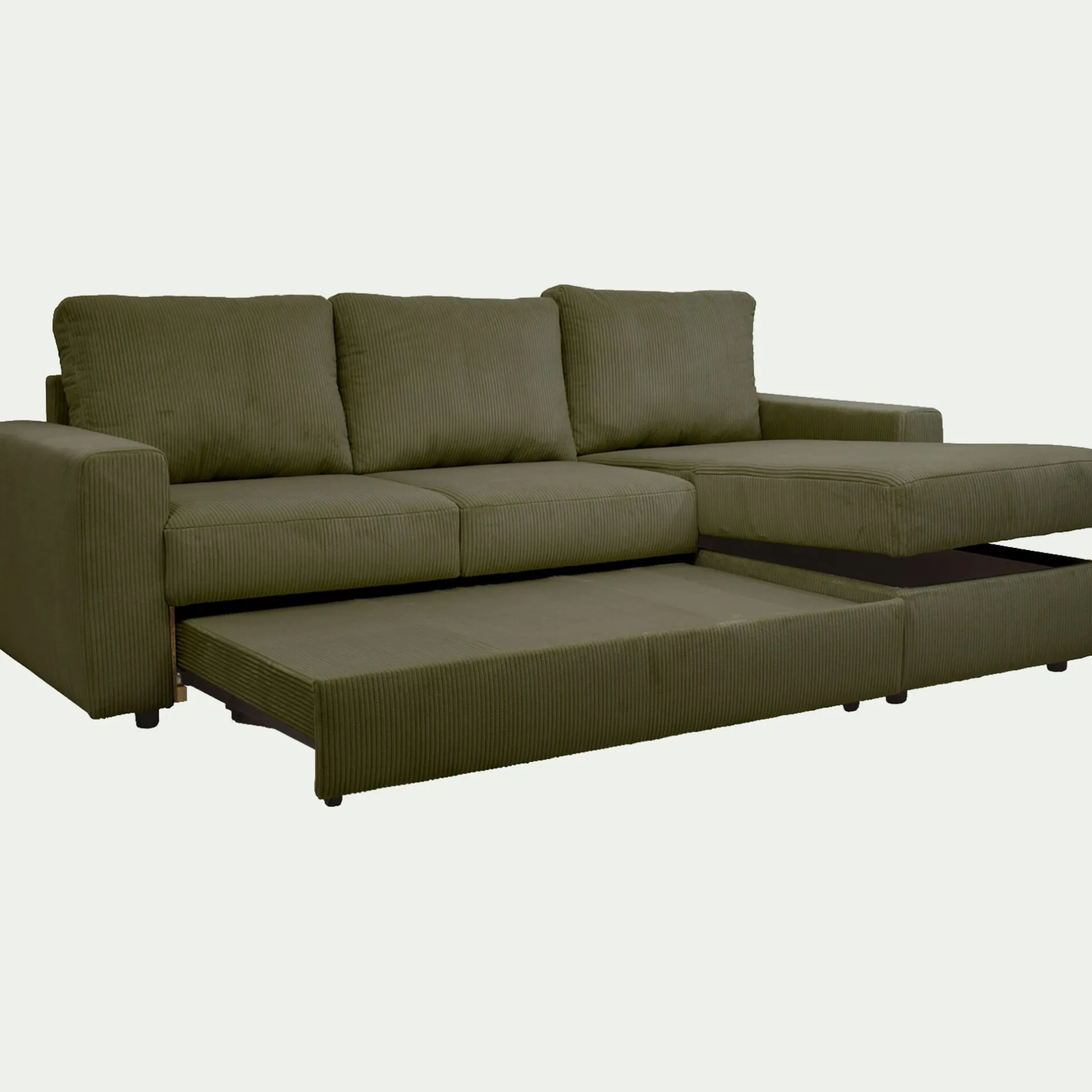 Le canapé Honoré cumule confort, praticité et élégance pour devenir la pièce maîtresse du salon. Son généreux format 4 places en velours côtelé vert cèdre invite à la détente, avec un dossier moelleux et une assise accueillante. Sa méridienne réversible, positionnable à droite comme à gauche, permet d’adapter facilement l’agencement selon l’espace disponible. Elle dissimule par ailleurs un coffre de rangement astucieux, idéal pour optimiser l’organisation du salon. Convertible, ce canapé se transforme en un couchage d’appoint de 140×200 cm, parfait pour recevoir en toute sérénité. Chaleureux et fonctionnel, il combine allure contemporaine et confort absolu, pour des instants de partage comme de repos.