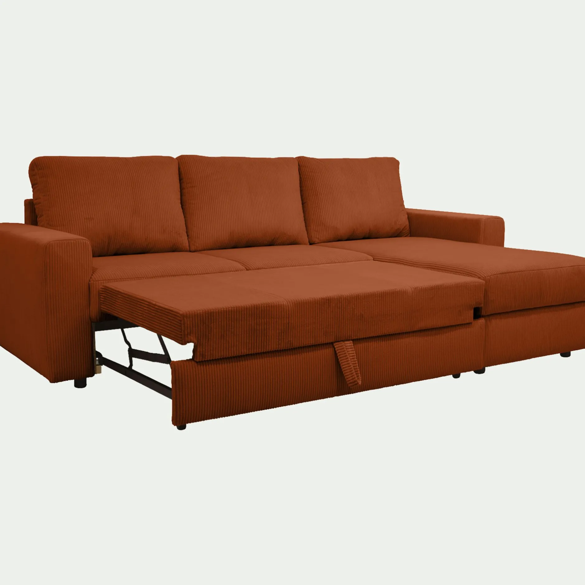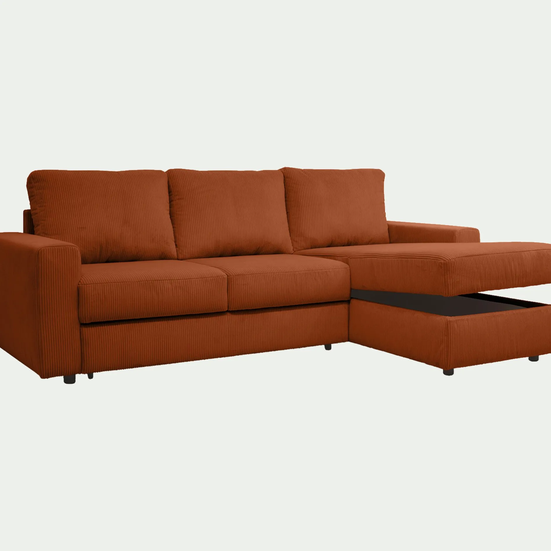 Un élégant canapé d’angle en velours côtelé 4 places pour votre salon. Son coloris brun rustrel apporte une touche de nature méditerranéenne tendance à votre décoration. Un canapé confortable doté d’épais coussins pour une assise d’une grande qualité. Ce canapé s’ouvre facilement et vous permet d’obtenir un lit pour vos convives. Un couchage occasionnel de grande taille, particulièrement utile. Sa méridienne peut être fixée aussi bien à droite qu’à gauche, afin que vous puissiez choisir l’angle. Elle vous offre également un grand coffre de rangement, idéal pour disposer un plaid, des couvertures et des oreillers. Entièrement conçu en France, ce canapé incarne le savoir faire et le charme à la française. Un canapé déco pour se détendre et passer d’agréables moments entre amis ou en famille.